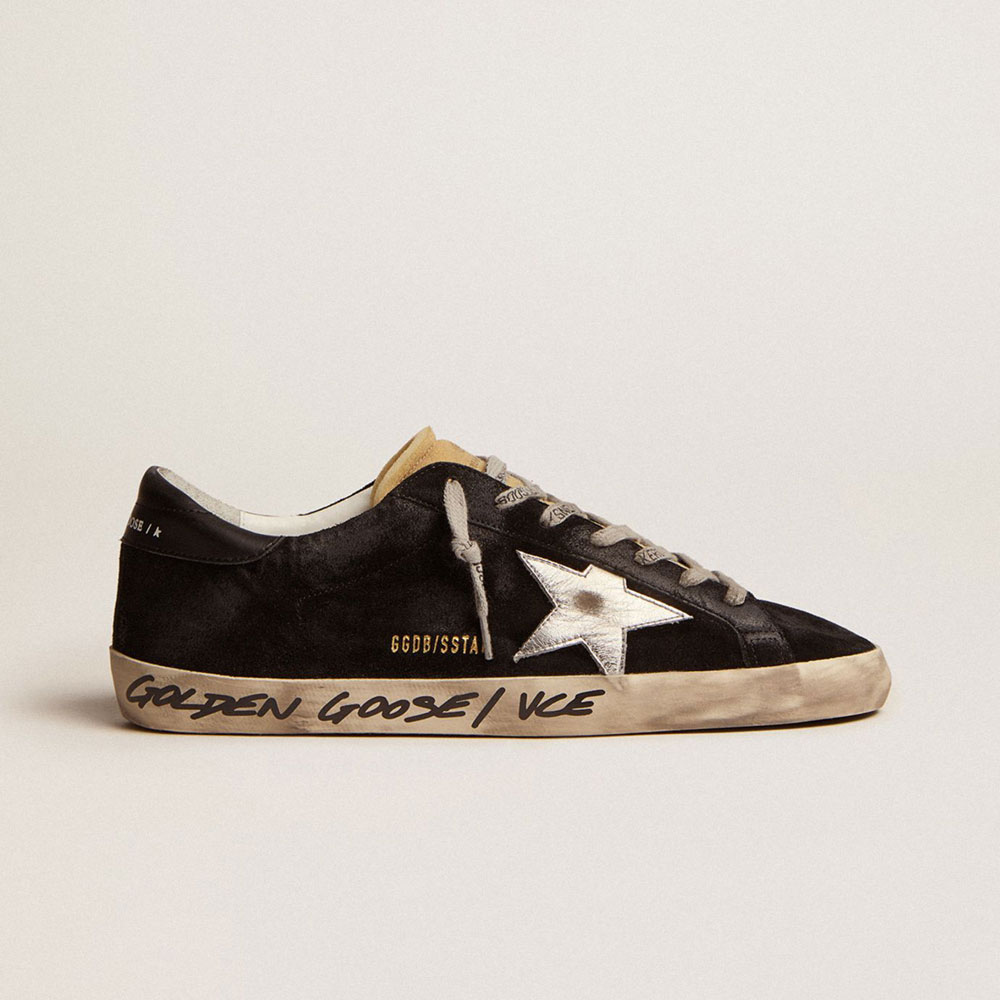 A timeless icon yet one thats constantly evolving. At Golden. we love taking our classics and reworking them all the time. always from a new angle. These Super-Star sneakers with black suede upper feature a silver metallic leather star. a black leather heel tab. and Golden Goose logo lettering screen-printed on the foxing. The ice-gray laces with contrasting black logo complete the look.