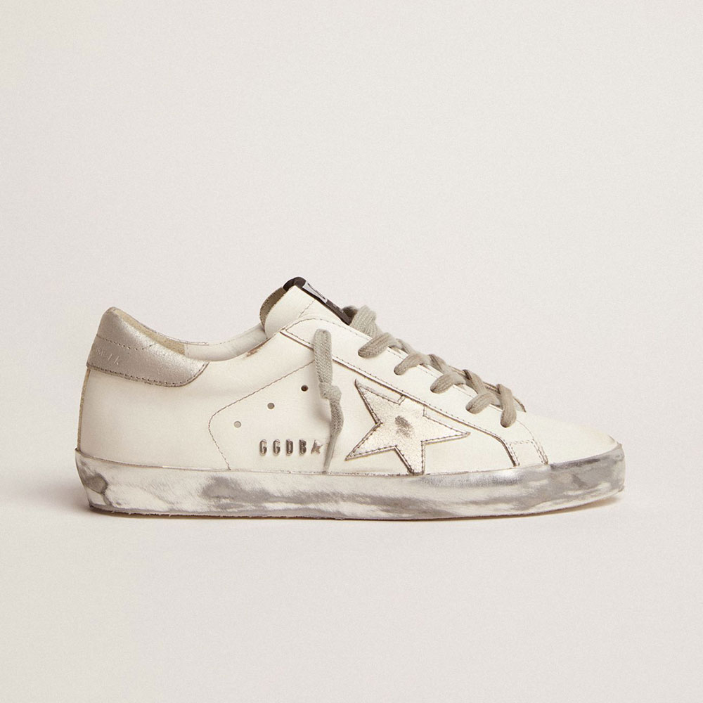 Super-Star sneakers are a Golden Goose evergreen and accompany its collections season after season. thanks to the use of innovative materials and finishes. Shiny details with silver sparkle foxing. combined with a GGDB star and coordinated heel tab give it a fun contemporary feel. This style features metal lettering.