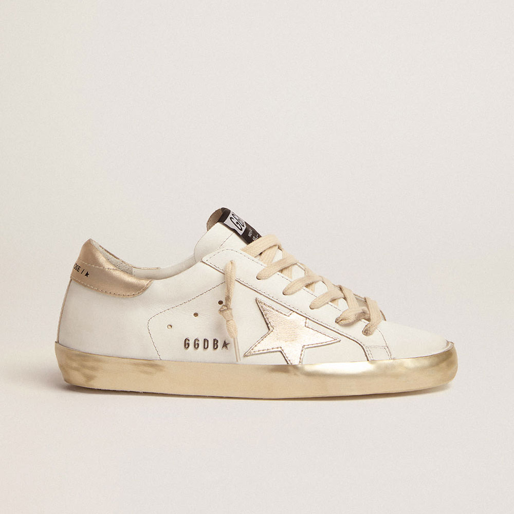 Womens Super-Star sneakers are a Golden Goose evergreen and accompany its collections season after season. thanks to the use of innovative materials and finishes. Shiny details such as the gold sparkle foxing. combined with coordinated GGDB star and heel tab give them a fun contemporary feel. This style features metal lettering.
