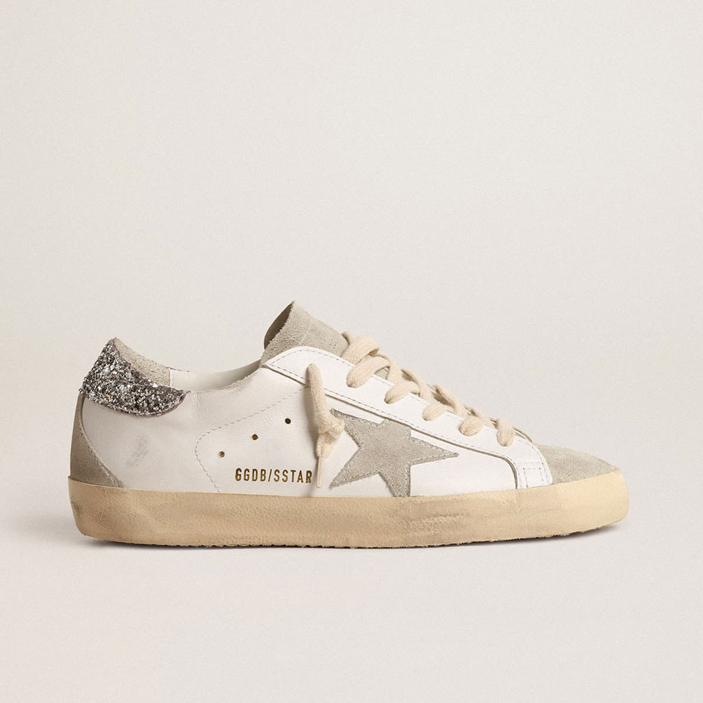 A timeless icon yet one thats constantly evolving. At Golden. we love taking our classics and reworking them all the time. always from a new angle. These Super-Star sneakers with a white leather upper feature an ice-gray suede star and a silver glitter heel tab. The ice-gray suede insert and tongue and cream laces add the finishing touch.
