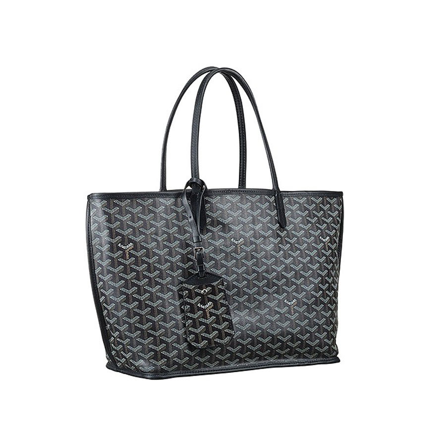 Reversible Goyard Y-pattern black calfskin leather exterior with black leather trimmings, a detachable leather name tag and two ultra-slim leather arm-carry straps Goyard Paris Made in France heat embossed leather lining A detachable coin purse in the interior Polished white metal trimmings Two ultra-slim leather arm-carry straps Colour: Black Size: 13.5" x 6.5" x 11" Inch