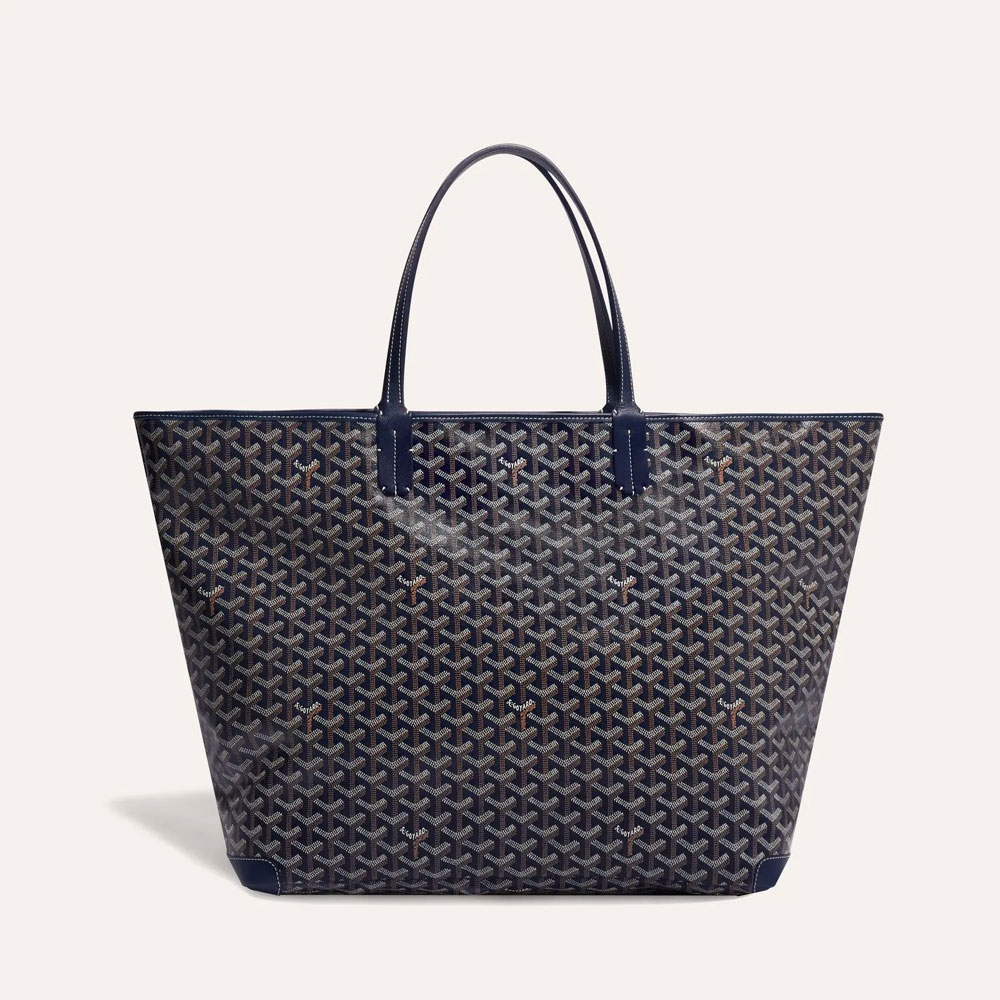 The Goyard Artois Bag in navy blue features elegant lines inspired by smaller versions of this collection.