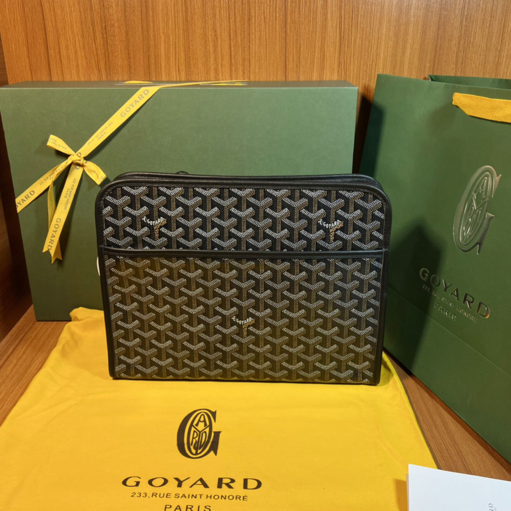 The Goyard Jouvence toiletry pouch features a spill-proof design for secure storage.