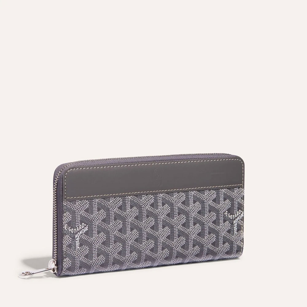 The Goyard Matignon GM billfold features a sleek zipper closure for security.