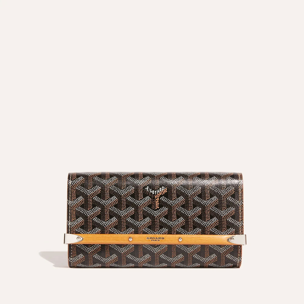The Goyard Monte-Carlo compact case showcases classic trunk elements like corner brackets and wooden rods.