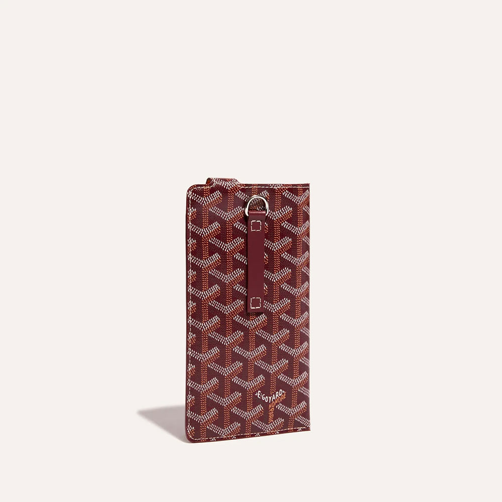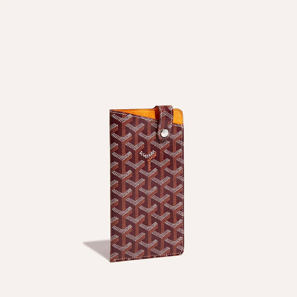 This goyard glasses case can be attached to a belt or worn crossbody. Its design includes a leather loop and stud.