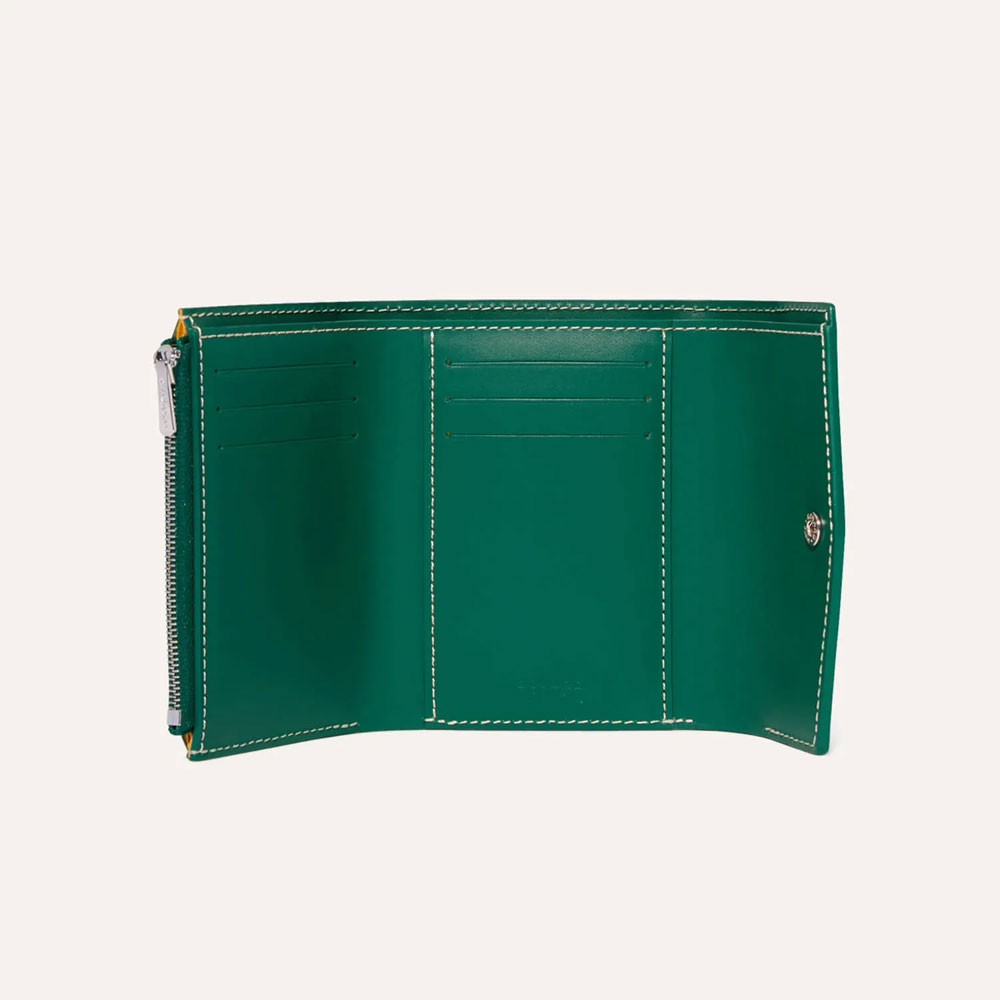 Compact and lightweight, this Goyard wallet unfolds in three sections for organized storage. Secured with a front snap button, it safely carries essentials.