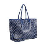 Dark blue coated canvas exterior with dotted chevron pattern print, a detachable coin purse that can be slung outside or kept safely inside bag and two ultra-slim flat leather arm-carry straps Textile lining in main bag exterior and Goyard and product code heat embossed leather lining in coin purse A small detachable coin purse Polished white metal trimmings Two ultra-slim flat leather arm-carry straps Color: Blue Size: 14" x 6" x 10.5"