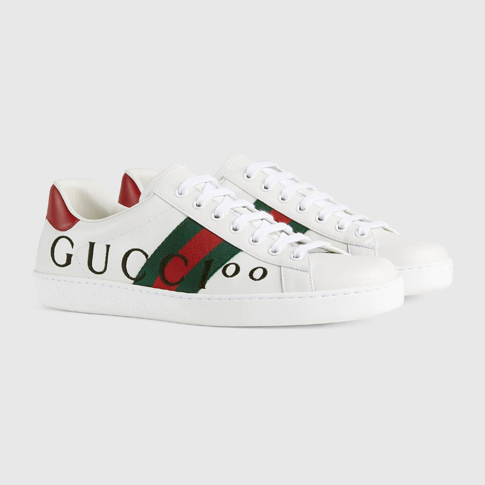 In honor of the Centennial. The Gucci Aria collection presents an homage to the brand's legacy. Reminiscent of the retro logo trend. this pair of Ace sneakers features a contrasting print that mixes the name of the House with 100.