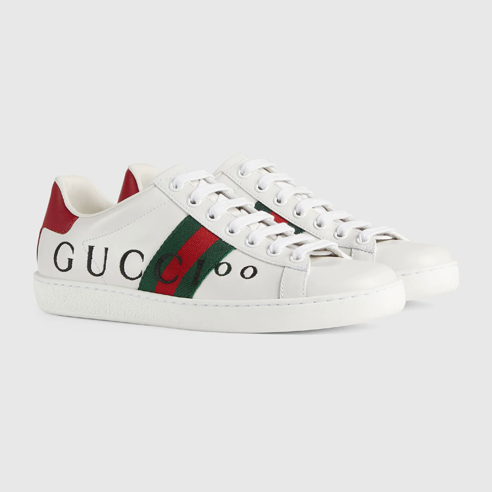 In honor of the Centennial. The Gucci Aria collection presents an homage to the brand's legacy. Reminiscent of the retro logo trend. this pair of Ace sneakers features a contrasting print that mixes the name of the House with 100.