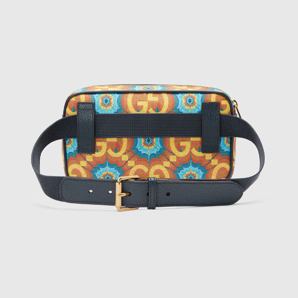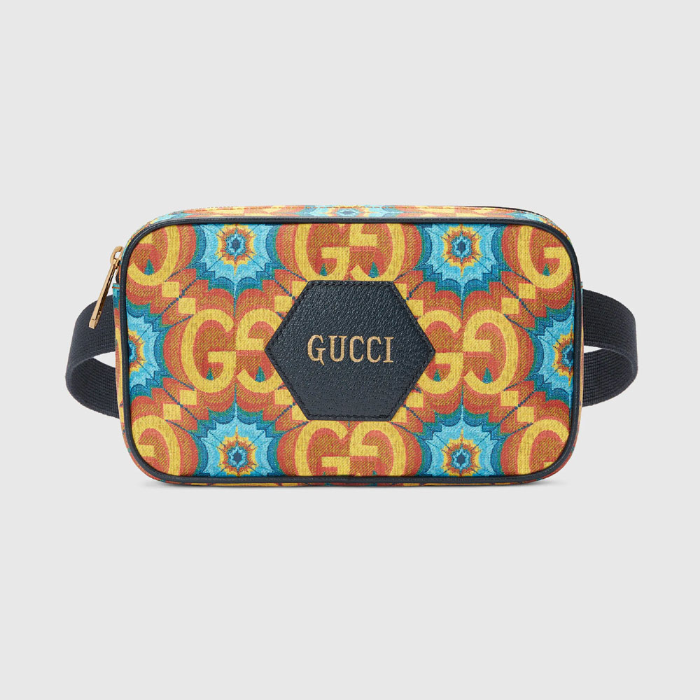 During its 100 years. Gucci has established itself as one of the most influential fashion houses. In honor of the Centennial. this belt bag celebrates the House's whimsical nature with a colorful print that mixes circles and GGs to create a playful kaleidoscope effect. A leather detail with the Gucci Script logo completes the style.