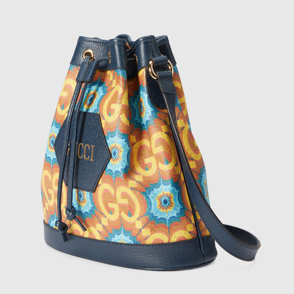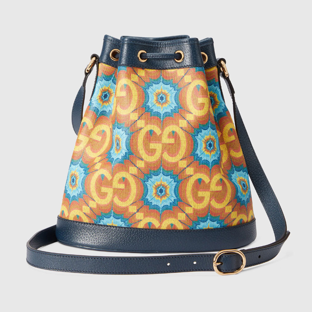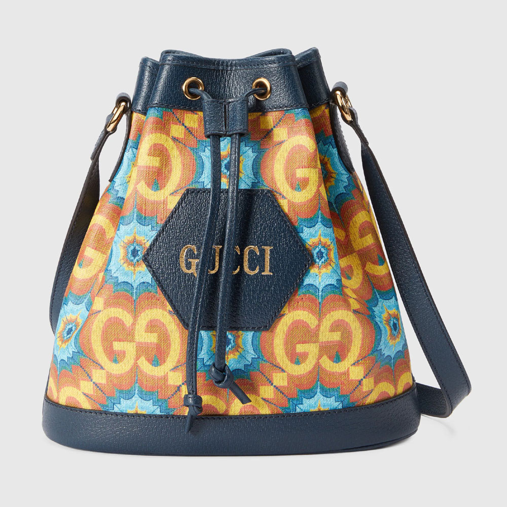 During its 100 years. Gucci has established itself as one of the most influential fashion houses. In honor of the Centennial. this Ophidia bucket bag celebrates the House's whimsical nature with a colorful print that mixes circles and GGs to create a playful kaleidoscope effect. A leather detail with the Gucci Script logo completes the style.
