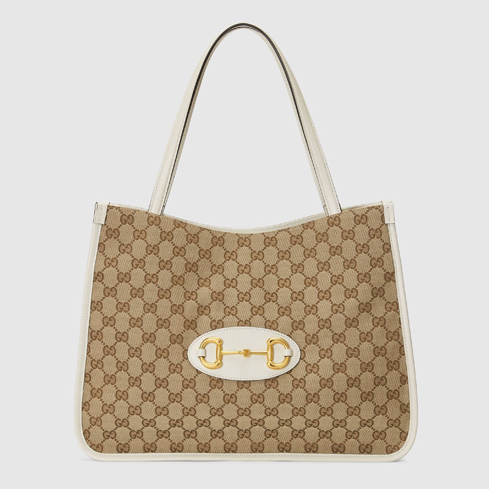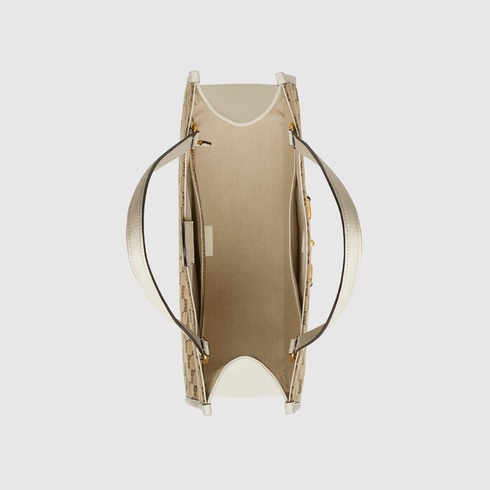 Designed with rounded edges and a soft shape. The Gucci 1955 Horsebit tote bag is made from GG Supreme canvas with white leather trim the double-handled silhouette is finished with an organizational interior and magnetic snap closure. The collection unifies details first introduced on the original bag that inspired the line from over six decades ago with a modern spirit. Highlighting the Horsebit. Part of Guccis genetic code. The double ring and bar design has been established as one of the most distinctive elements among the House symbols borrowed from the equestrian world.