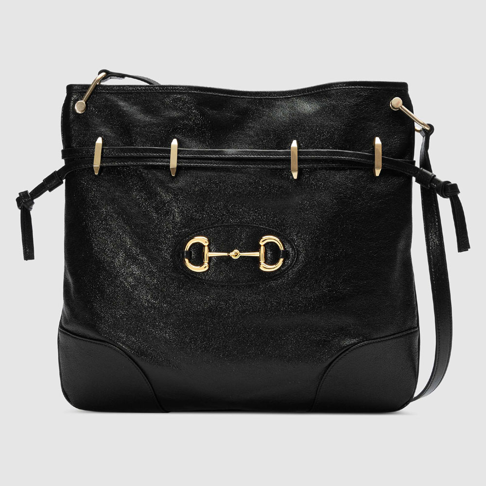 Inspired by archival designs. Gucci 1955 Horsebit messenger bag unifies the original details first introduced over six decades ago with a modern spirit. Highlighting the Horsebit. Part of Gucci's genetic code. The double ring and bar design has been established as one of the most distinctive elements among the House symbols borrowed from the equestrian world. The hardware is paired with soft black leather and a detailed drawstring closure detail.