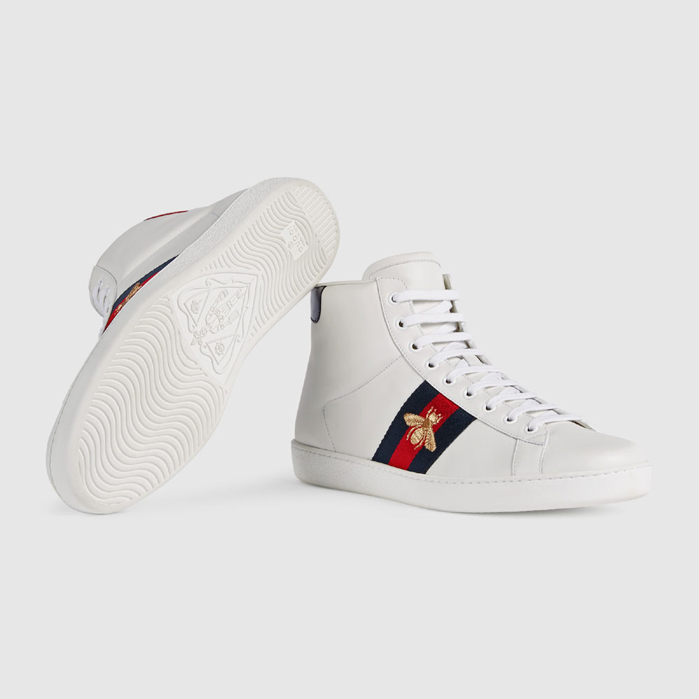 Since its debut, the Ace sneaker has become a mainstay of Gucci collections. The retro-looking design is inspired by a vintage Gucci sneaker with Web stripe along the sides. The high-top silhouette has been embellished with a gold embroidered bee a House code from the 1970s.