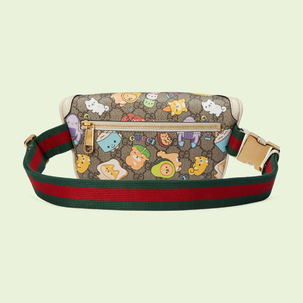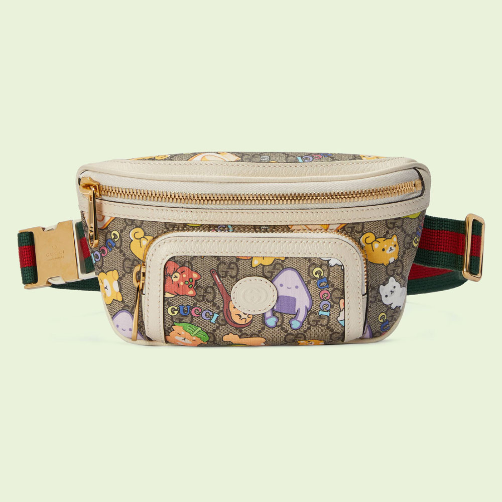 The artwork by America-based illustrator and designer. Angela Nguyen. also known as 'Pikarar'. adds a playful touch to ready-to-wear pieces and accessories with vibrant prints or embroideries inspired by pop culture. anime. and animals. Here this belt bag is defined by a Gucci animal print.