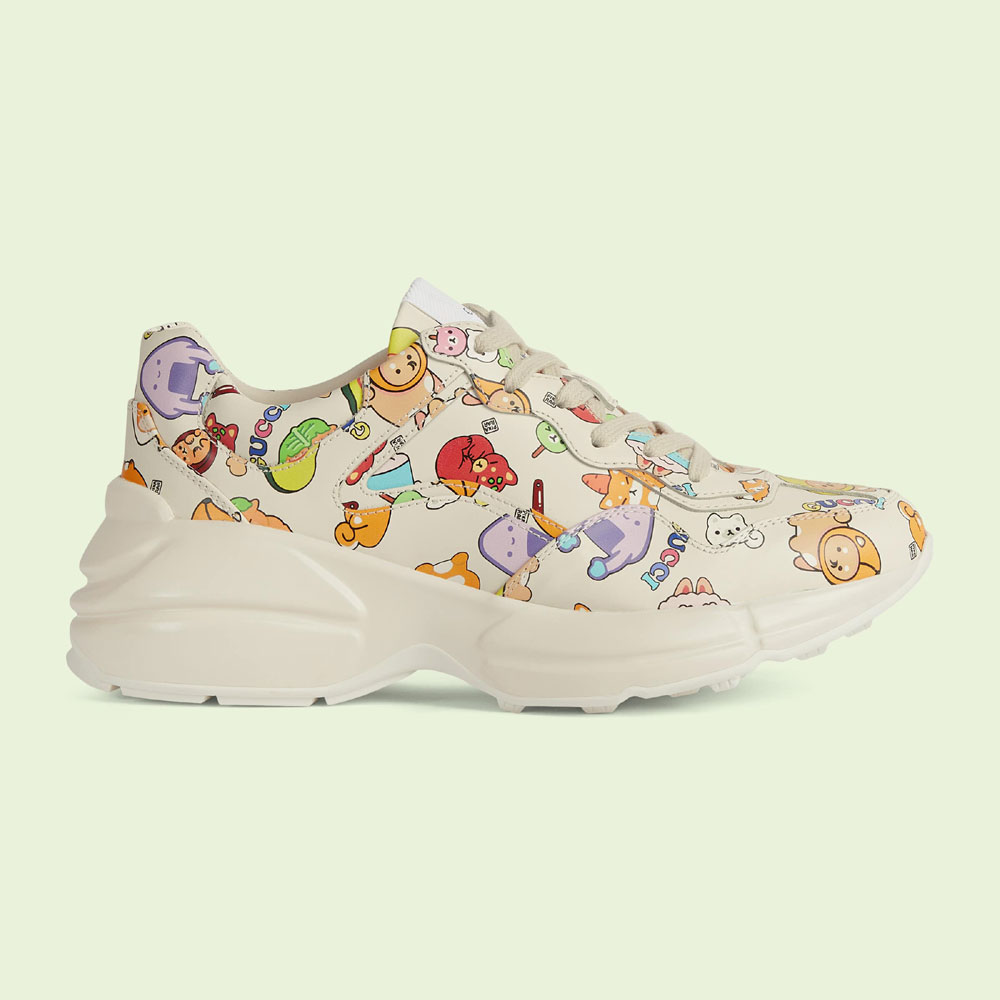 The artwork by America-based illustrator and designer. Angela Nguyen. also known as 'Pikarar'. adds a playful touch to ready-to-wear pieces and accessories with vibrant prints or embroideries inspired by pop culture. anime. and animals. Here this Rhyton sneaker is defined by a Gucci animal print.