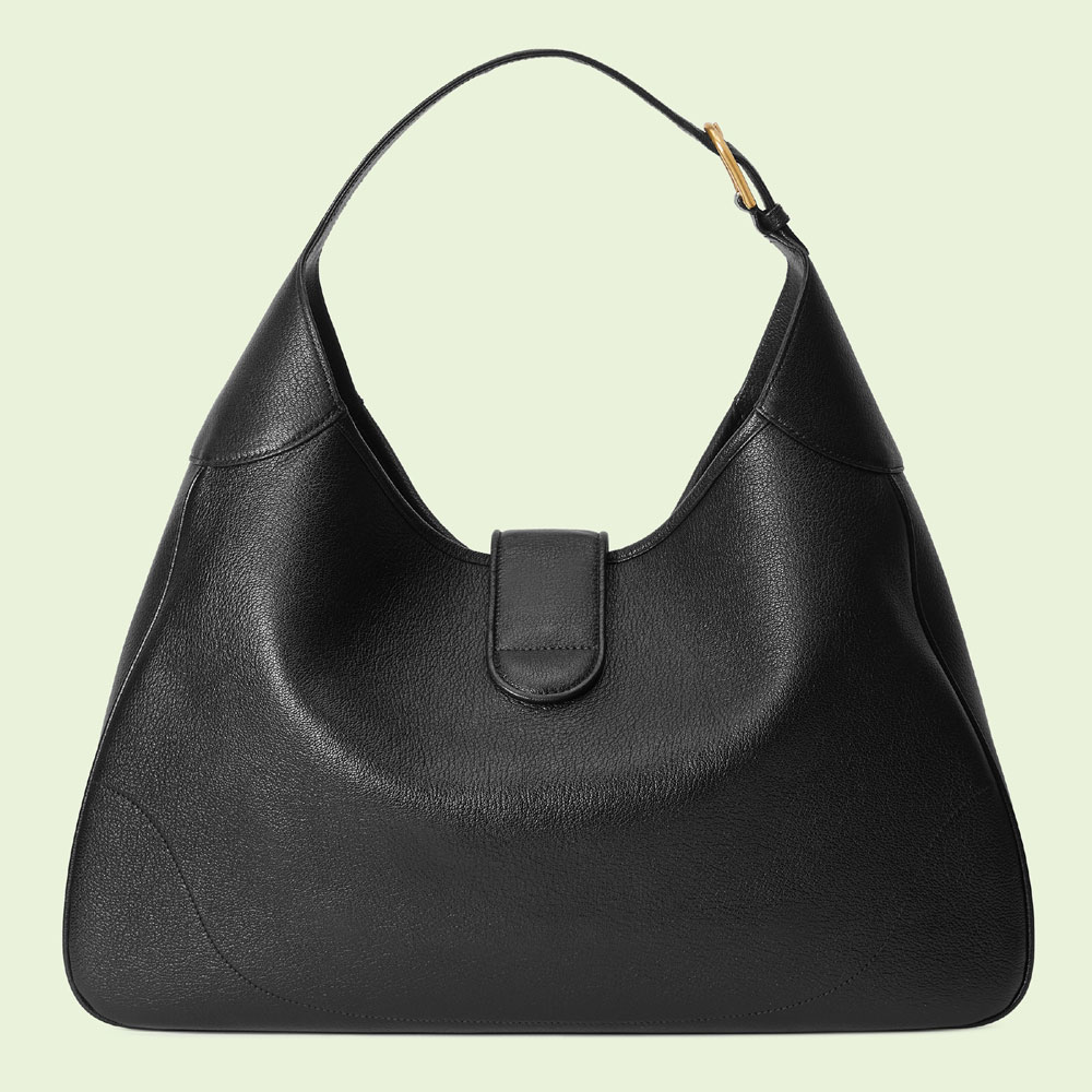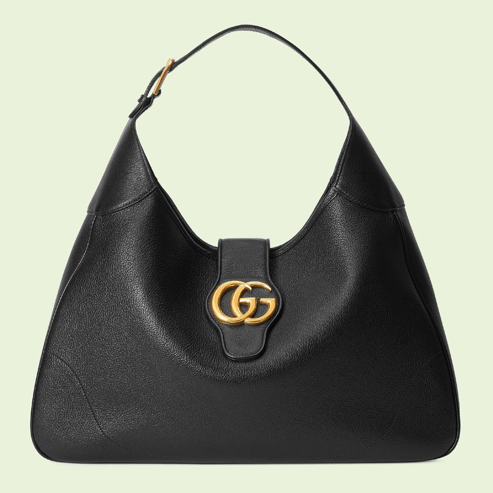 Gucci's contemporary narrative explores a unique blend of traditional elements and the much-loved symbols of the House. This spacious shoulder bag is presented in black soft leather with a striking Double G emblem across the closure.