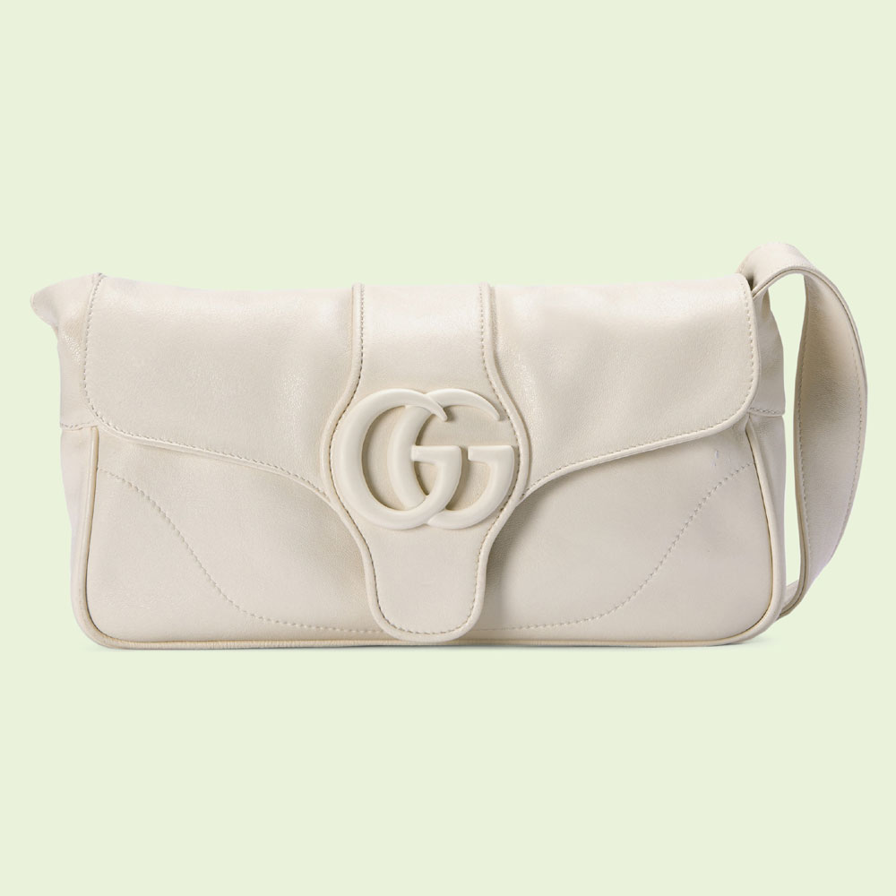 Gucci's contemporary narrative explores a unique blend of traditional elements and the much-loved symbols of the House. This small yet spacious shoulder bag is presented in white soft leather with a striking Double G emblem across the closure.