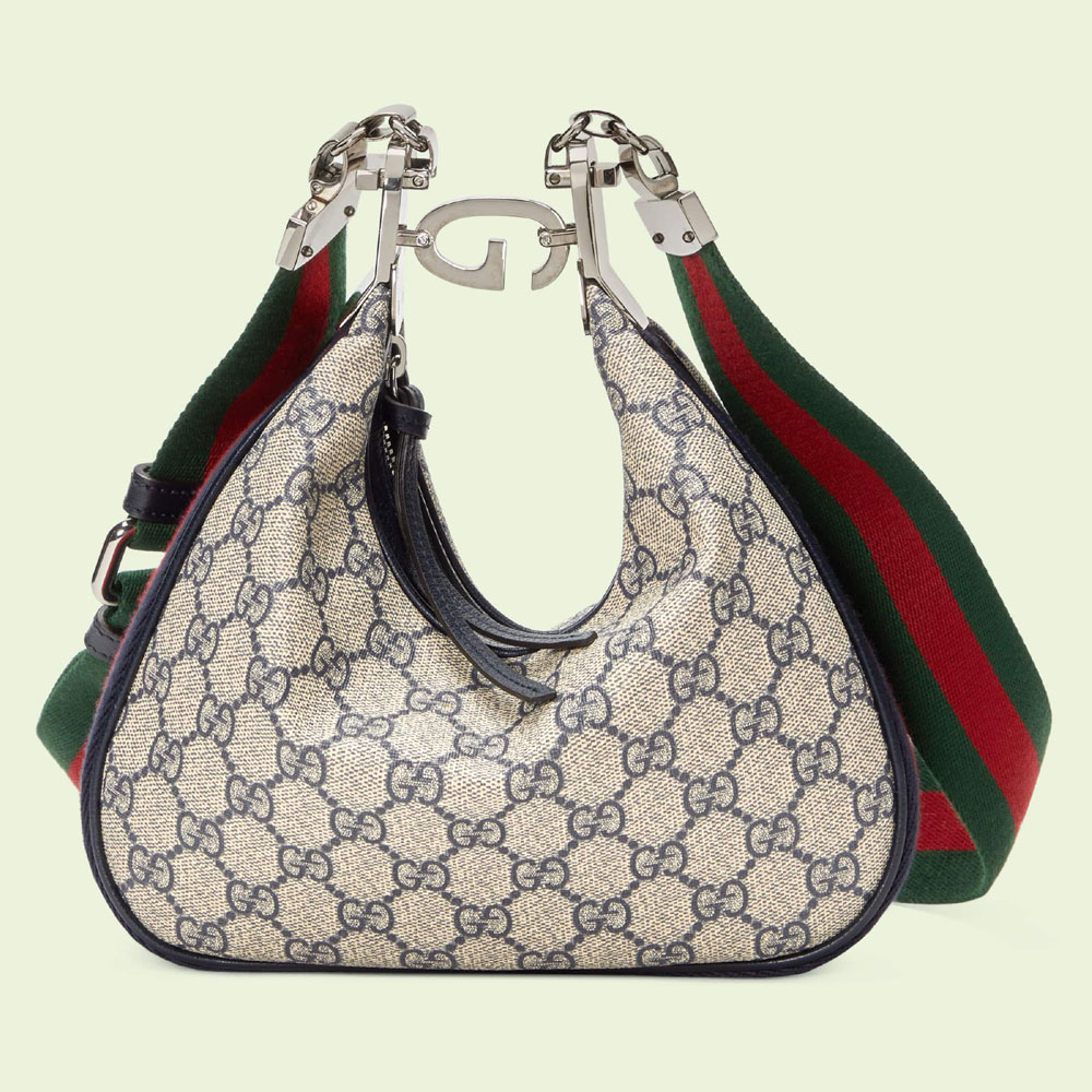 An ode to the timeless Hollywood glamour that shaped Gucci Love Parade. classic elements from the House's archives are reintroduced. Distinguished by its crescent moon shape. this small shoulder bag further defined by a G shaped hook closure. Paired with soft materials. the heritage hardware creates a refined design with vintage appeal. GG Supreme canvas in beige and blue accentuate the logo feel.