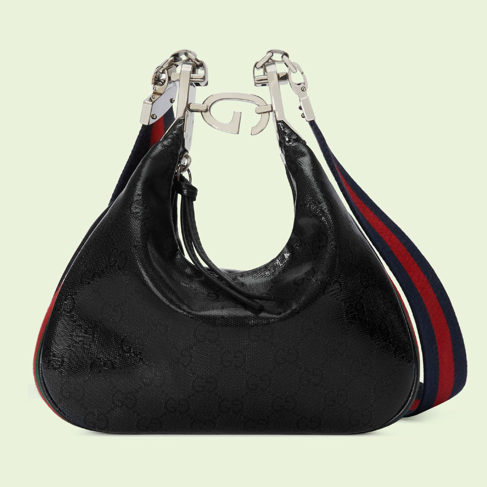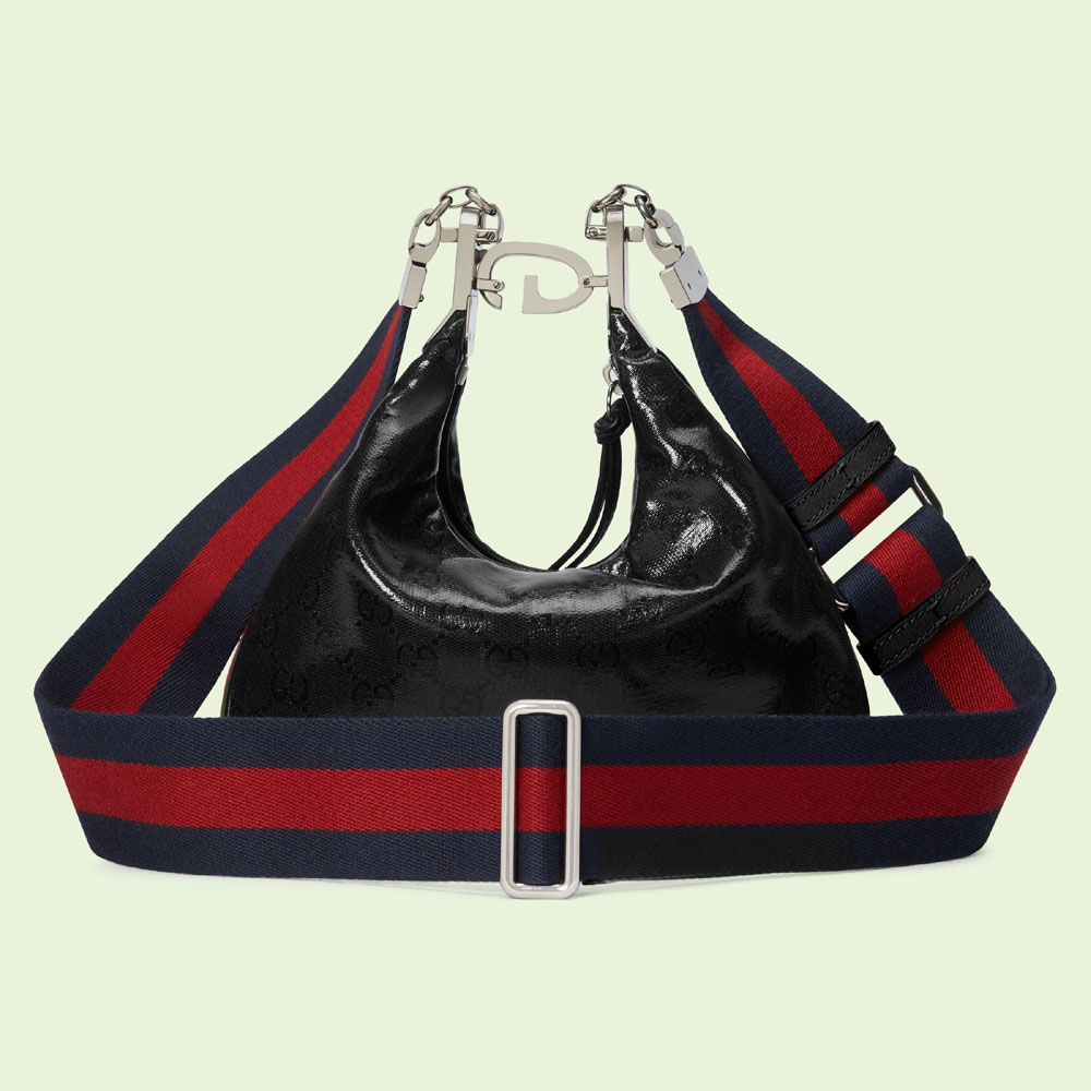 The GG Crystal canvas. with its lustrous surface and durable characteristics. lends itself well to the men's Fall Winter 2023 accessories line. adding a modern feel to established House designs. Distinguished by its crescent moon shape. this small shoulder bag is further defined by a G shaped hook closure. Paired with soft materials. the heritage hardware creates a refined design with vintage appeal. Size:23 x 22 x 5CM