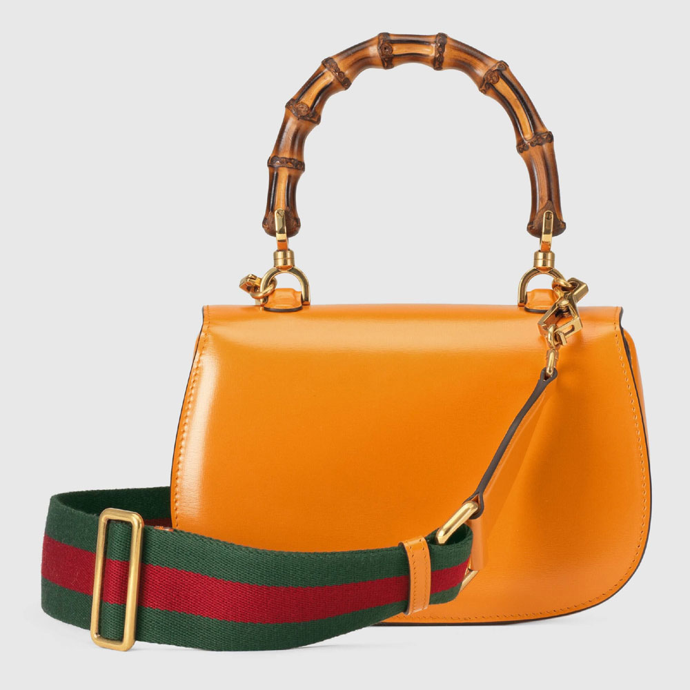 A material that speaks to the long-lasting traditions that come together to create Gucci's heritage. this bag's bamboo handles are expertly curved using a flamea process originally conceived by Florentine artisans during the postwar period. The yellow leather style is enriched by a detachable Web strap that allows the accessory to be worn on the shoulder or as a top handle. Versatile designs appear throughout The Gucci Aria collection enriching styles with multiple ways to wear so that they can be worn again and again. creating timeless pieces.