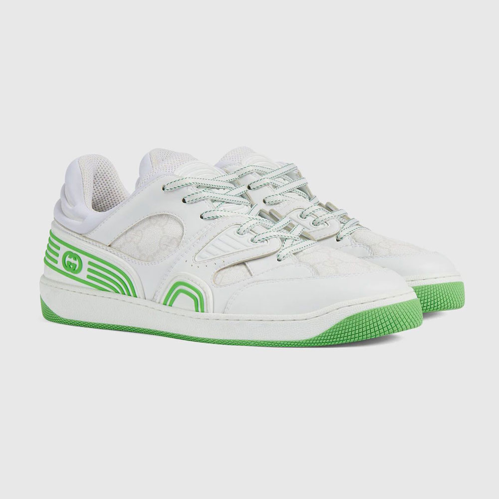 Sporting a look synonymous with basketball sneakers from the 90s. the House introduces the newest rendition of the lace-up sneakerGucci Basket. This low top style emulates the self-expression of on-court aesthetic with distinctive features and detailing. Presented in grey with green accents and finished with a lightly distressed effect. each pair is crafted primarily from Demetra. Created with the same processes used for tanning. the new material offers pliable and resilient performance with a supple finish. The eco-friendly material combines animal-free raw materials primarily from sustainable. renewable. and bio-based sources.