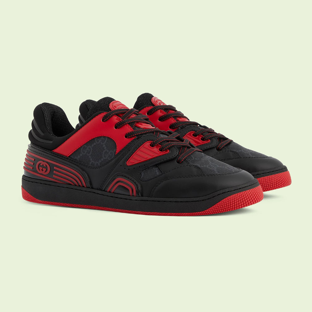 Taking inspiration from '90s basketball sneakers. the Gucci Basket evolves throughout the latest collections. This black and red low-top variation emulates the self-expression of on-court aesthetic with distinctive features and detailing. The style is completed by Demetera accents. an eco-friendly material combines animal-free raw materials primarily from sustainable. renewable. and bio-based sources. Created with the same processes used for tanning. the material offers pliable and resilient performance with a supple finish.