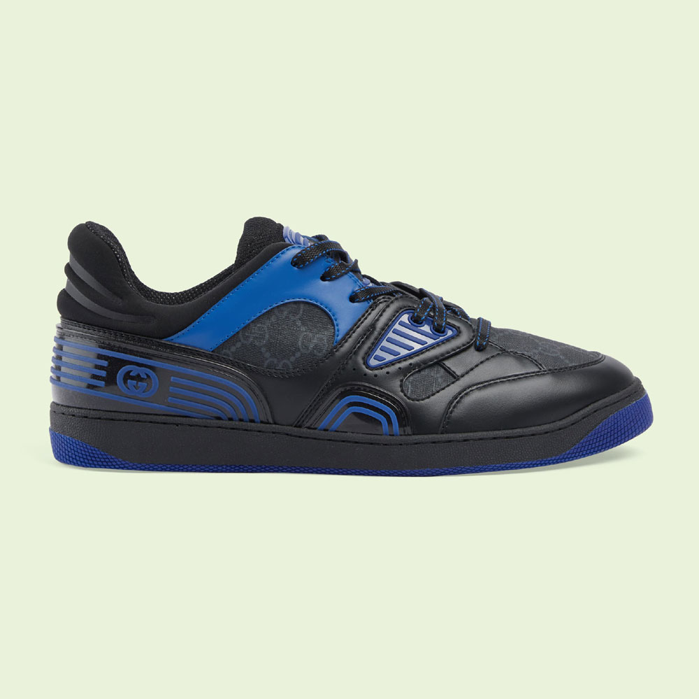 Taking inspiration from '90s basketball sneakers. the Gucci Basket evolves throughout the latest collections. This black and blue low-top variation emulates the self-expression of on-court aesthetic with distinctive features and detailing. The style is completed by Demetera accents. an eco-friendly material combines animal-free raw materials primarily from sustainable. renewable. and bio-based sources. Created with the same processes used for tanning. the material offers pliable and resilient performance with a supple finish.