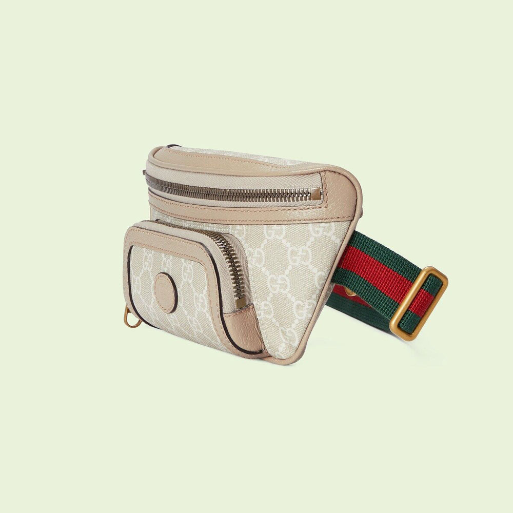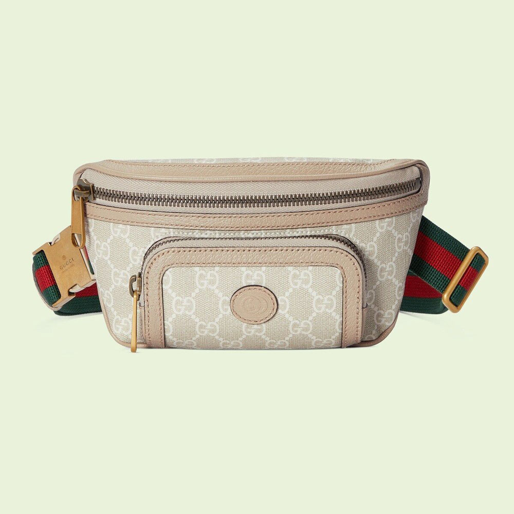 An archival design from the 1930s inspired the GG Supreme canvas. now one of the House's most emblematic materials. Traditionally presented in beige and ebony. it appears here in a beige and white combination. an ode to timeless pieces and everlasting design. An oatmeal leather trim completes this belt bag. while the green and red Web strap adds a subtle reference to the House archives.