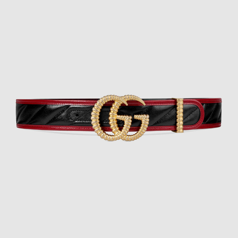 Inspired by the GG Marmont handbags from the Pre-Fall 2019 collection. This belt is presented in black leather with a diagonal matelasse effect. The accessory is accentuated by the textured. Torchon Double G an archival reprisal of the House's signature emblem.