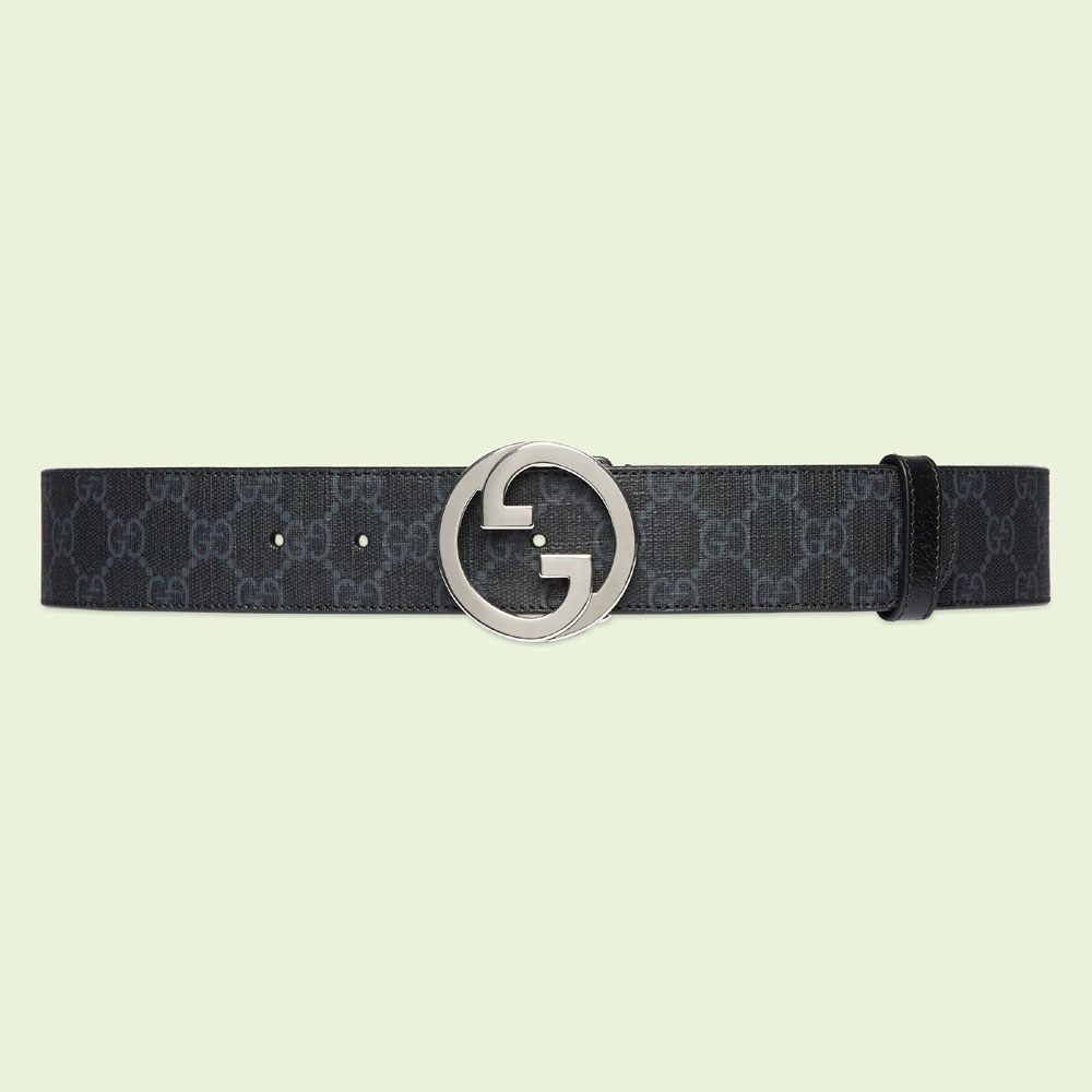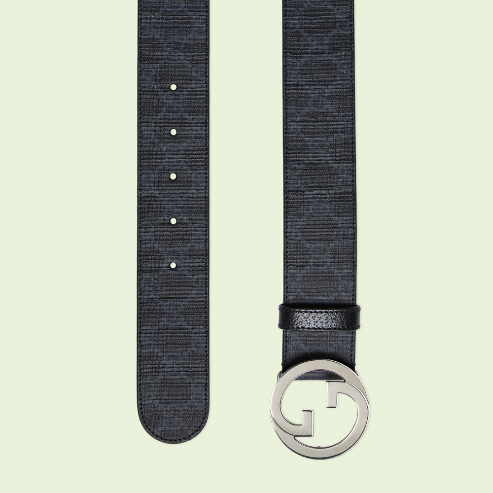 Accessories continue to play upon heritage elements. Here. the historic GG monogram appears distinguished by an archival iteration of the House's rounded Interlocking G hardware. This belt is crafted from black GG Supreme canvas with black leather trim.