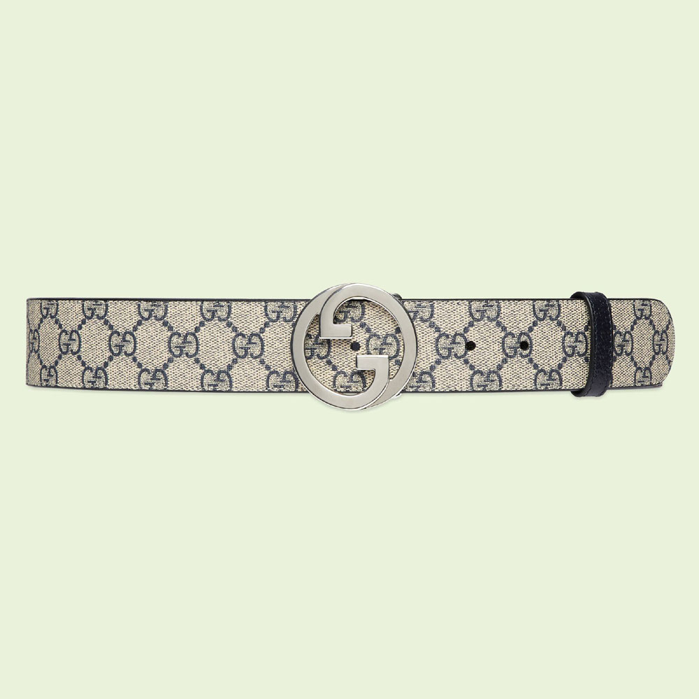 The historic GG Supreme material has become a halfmark of the House. Here. the emblematic monogram appears on this belt presented in black and blue GG Supreme canvas. A blue leather trim defines the accessory.