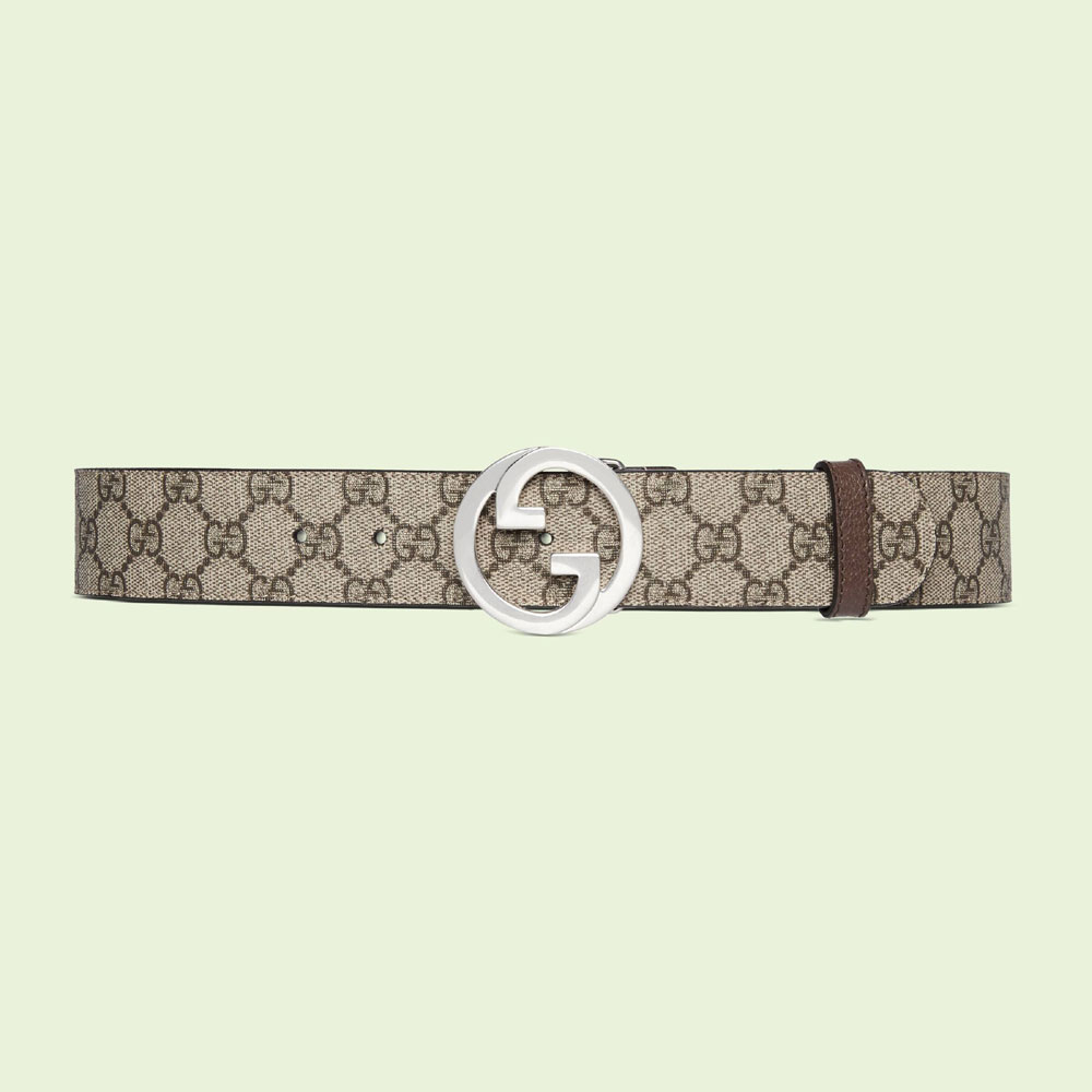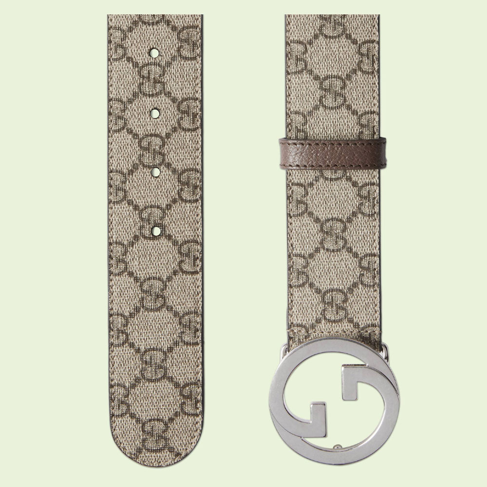 Accessories continue to play upon heritage elements. Here. the historic GG monogram appears distinguished by an archival iteration of the House's rounded Interlocking G hardware. This belt is crafted from beige and ebony GG Supreme canvas with brown leather trim.