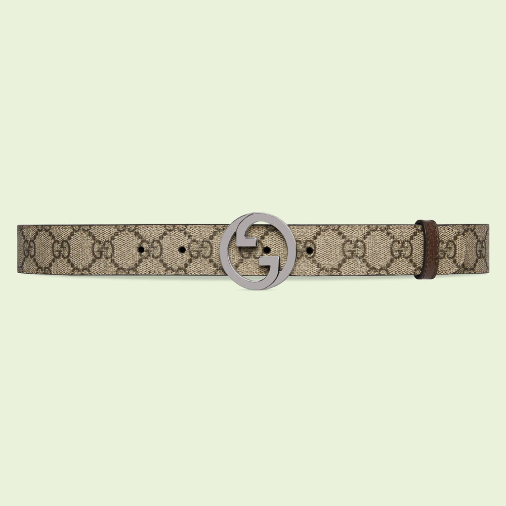 Accessories continue to play upon heritage elements. Here. the historic GG monogram appears distinguished by an archival iteration of the House's rounded Interlocking G hardware. This belt is crafted from beige and ebony GG Supreme canvas with brown leather trim.