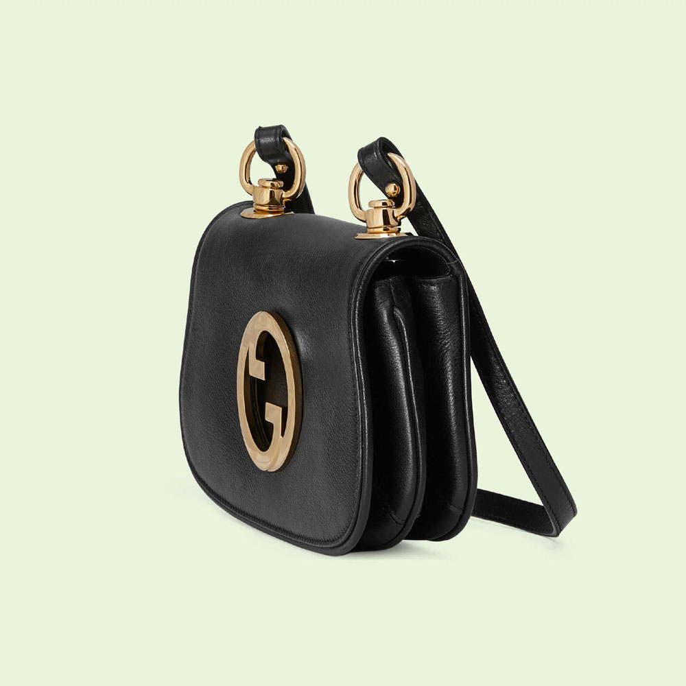 Coming from the House's archives. a geometrically shaped version of the Interlocking G logo is reintroduced for Gucci Love Parade. The gold-toned hardware adds a defined vintage feel to the style. enriching the design with a timeless feelmirroring the Hollywood glamour that shaped the fashion show. The black leather min bag is completed by two interchangeable shoulder straps. in tonal leather or the Web stripe.