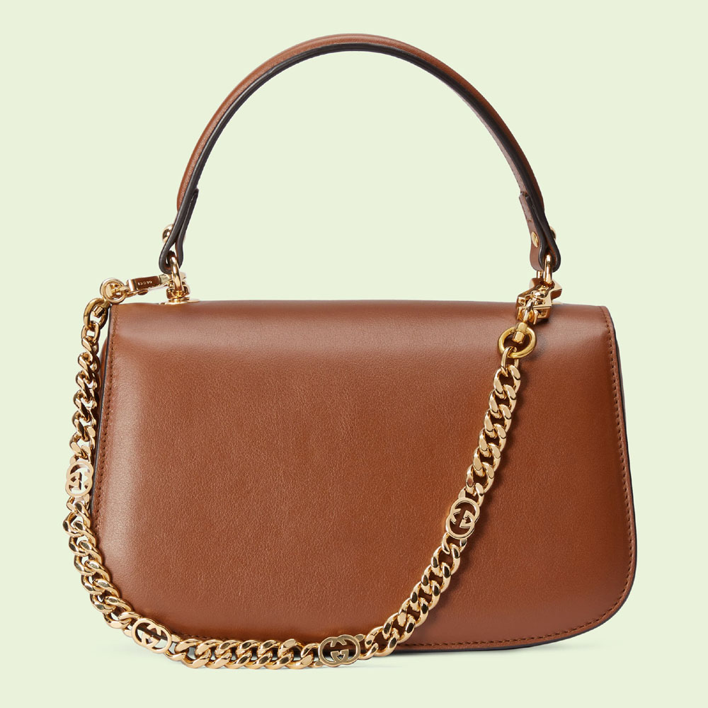 Taking inspiration from the House's archives. a geometrically shaped version of the Round Interlocking G logo sits atop this top handle bag. The gold-toned hardware adds a defined vintage feel to the style. enriching the design with a timeless feel.