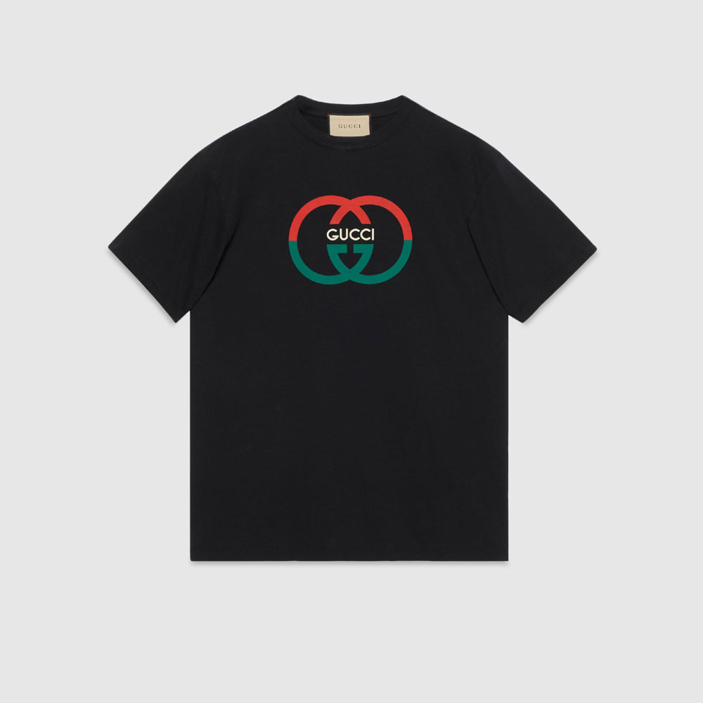 Welcoming warmer days, the men's Cruise 2024 collection presents sportier pieces with vibrant prints. The Web continues to lend an archival touch, while logo details take on bold modernity. This black cotton jersey T-shirt is enriched with a contrasting Interlocking G and Gucci print, making a bold style statement.