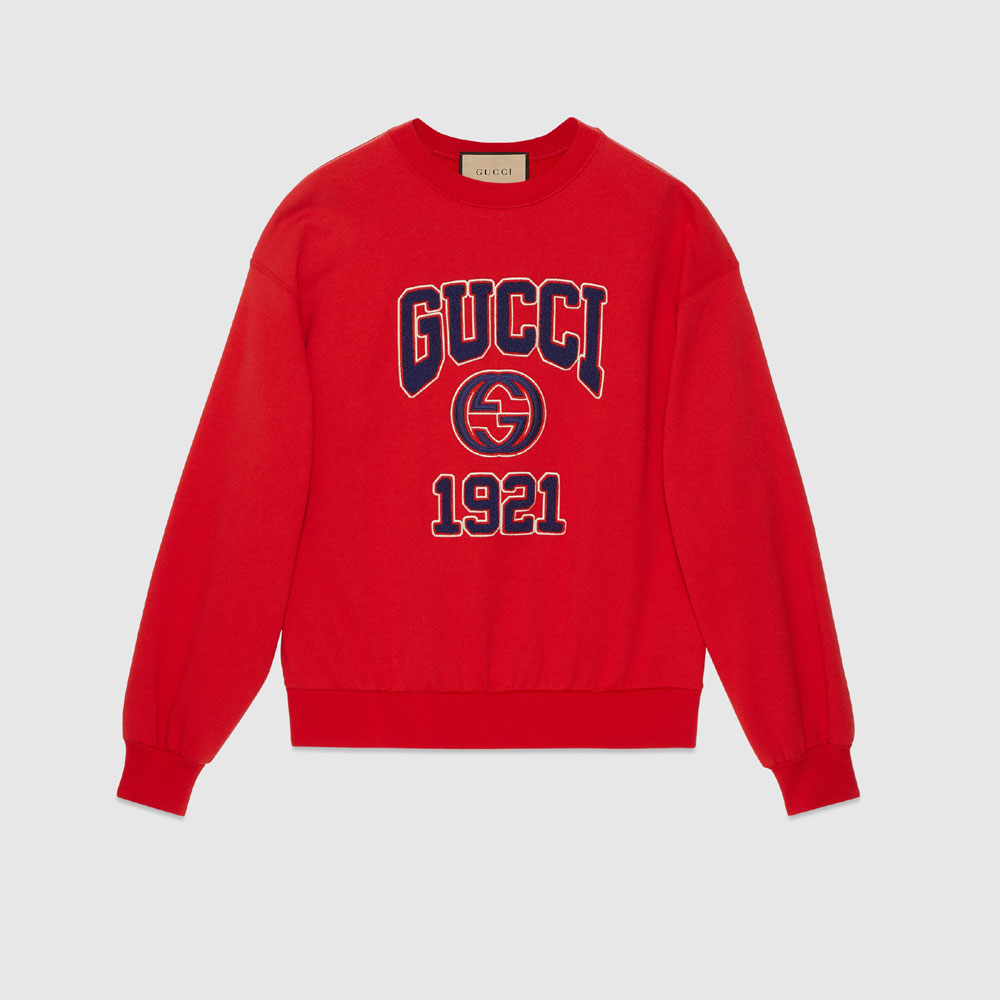 A relaxed attitude speaks volume as casual pieces become indispensable. Sweatshirts, hoodies, and t-shirts with drop shoulders, cropped lengths, and generous fits are adorned with signature embellishments. This sweatshirt is crafted from red felted cotton jersey and features the Interlocking G and Gucci 1921 embroidery.