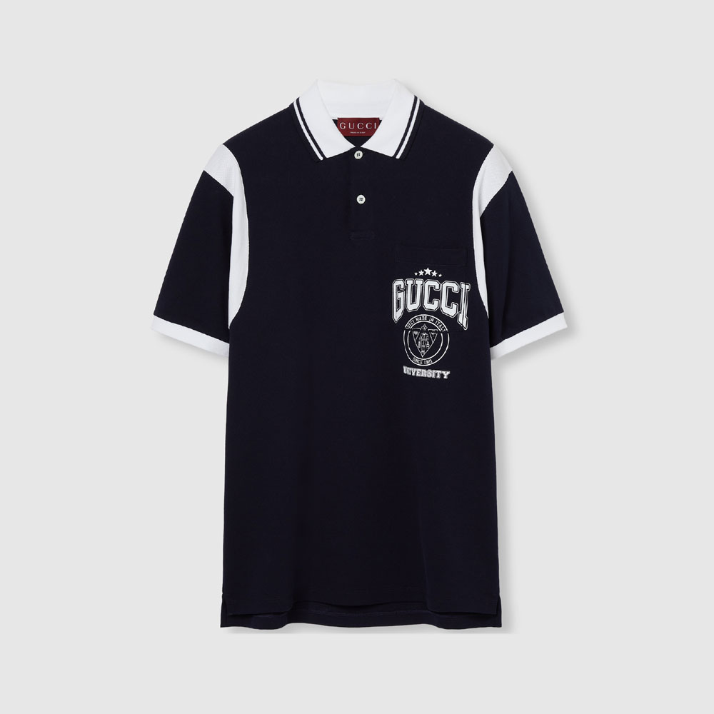 Gucci Cotton Piquet Polo Shirt in Navy offers versatile styling options for men. Pair it with crisp white slim-fit chinos for a polished daytime look, or layer under a tailored beige linen blazer to elevate evening sophistication.