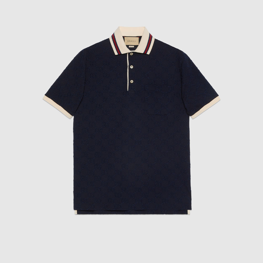 Styling the Gucci Cotton Polo Shirt for Men: This dark blue polo with iconic GG embroidery effortlessly transitions from smart-casual to urban streetwear. Pair it with tailored beige chinos and leather loafers for a polished daytime look. For a relaxed vibe, layer it under a lightweight black bomber jacket and match with distressed jeans and white sneakers.