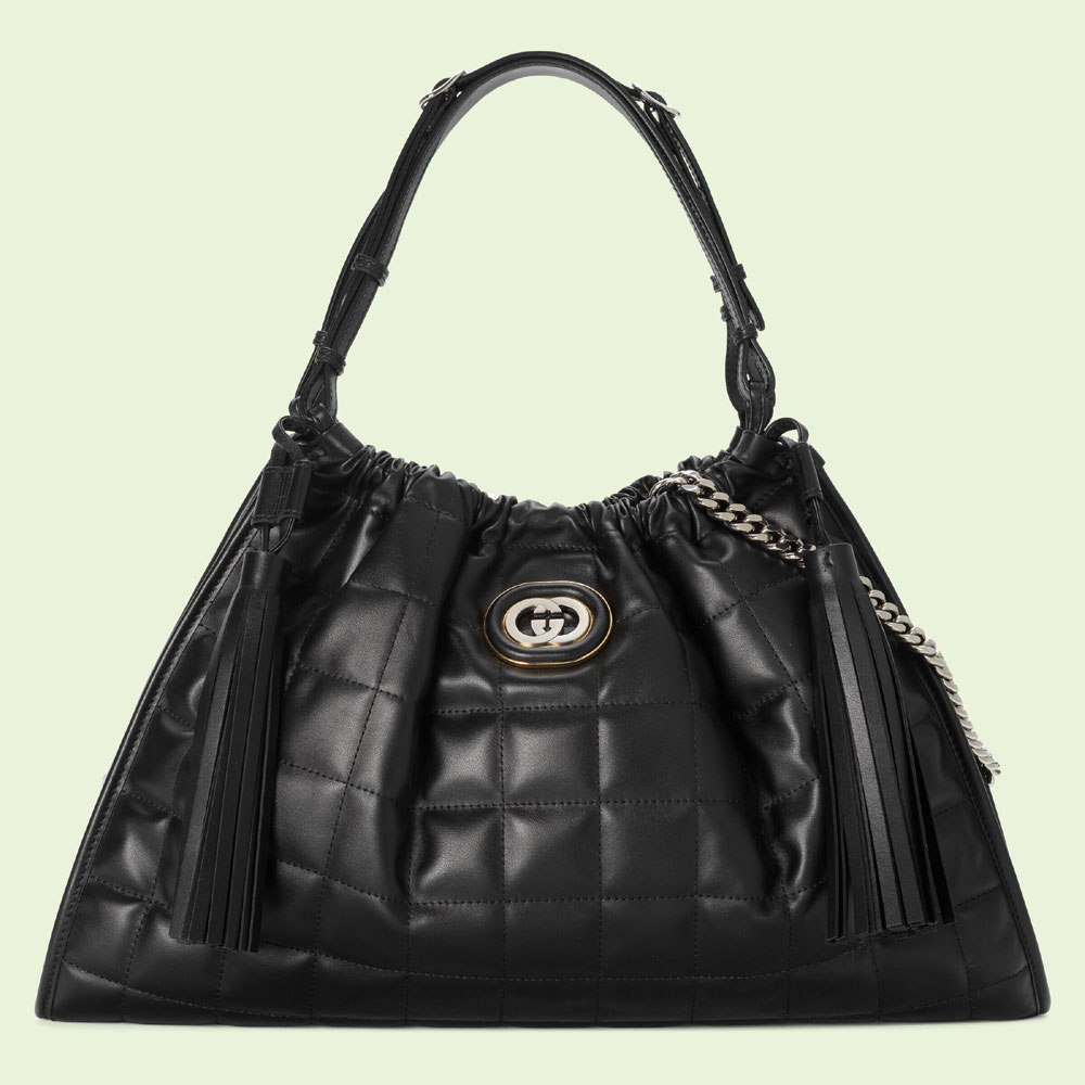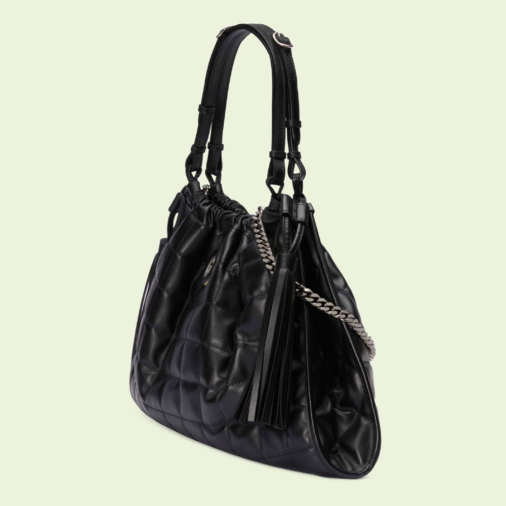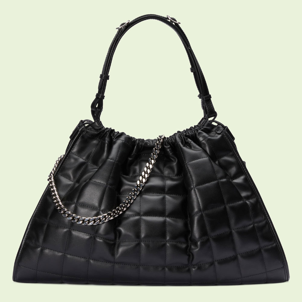 Heritage and innovation combine in this elevated version of the everyday tote. Designed with a relaxed silhouette. the new Gucci tote bag combines quilted materials with a chain strap and a roomy structure. providing style. versatility and practicality.