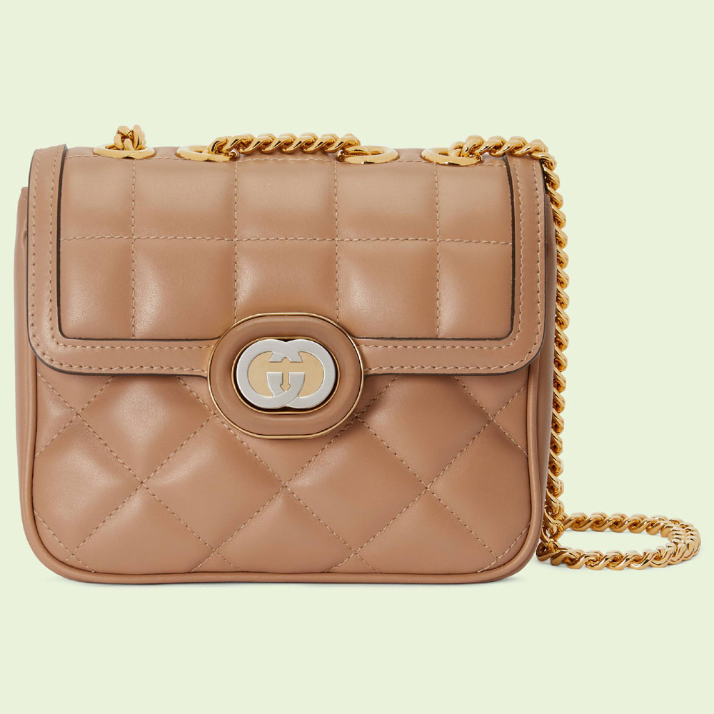 Classic silhouettes and refined materials explore new expressions and a deep-rooted fascination for the past. A quilted design plays with geometries across this compact shoulder bag. highlighting emblematic symbols from the archive for a retro feel. Interlocking G hardware on the flap closure makes a statement against the tonal 1970s inspired leather trim.