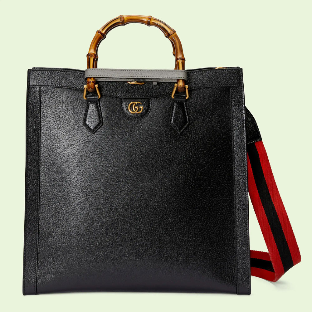 The Gucci Diana line evolves as part of the Gucci Love Parade collection to include a range of elegant luggage pieces. The sophisticated design of this large tote bag combines recognizable archival details of the House; bamboo handles and Double G hardware. Crafted from black leather. the style is further accentuated by two bands. a reference to the original bands used to keep handles in shape. This item is part of Guccis MX. a selection that embraces freedom of expression and explores identity norms.
