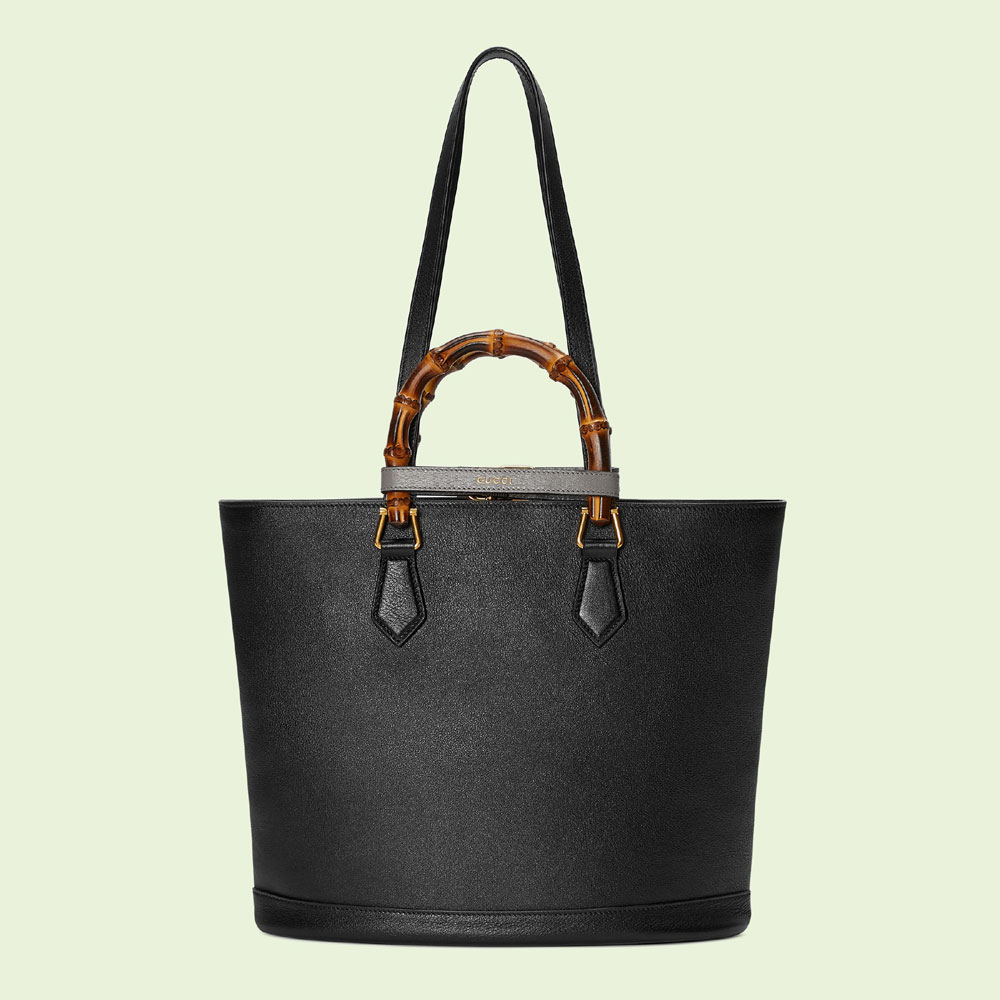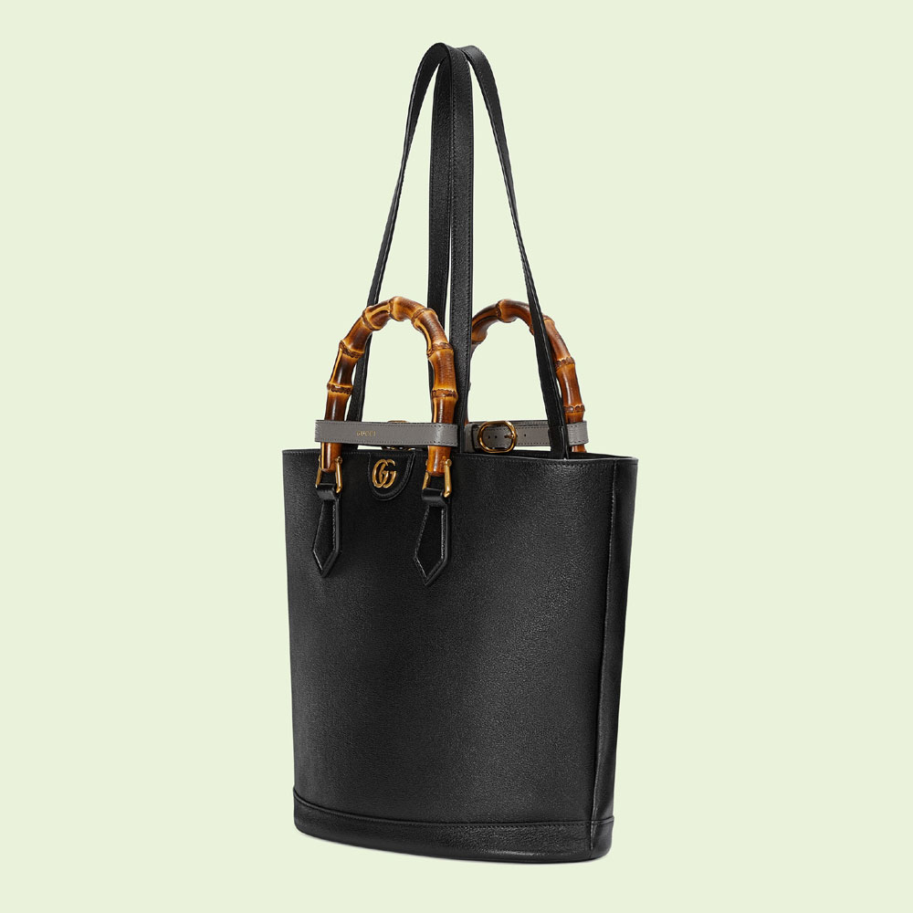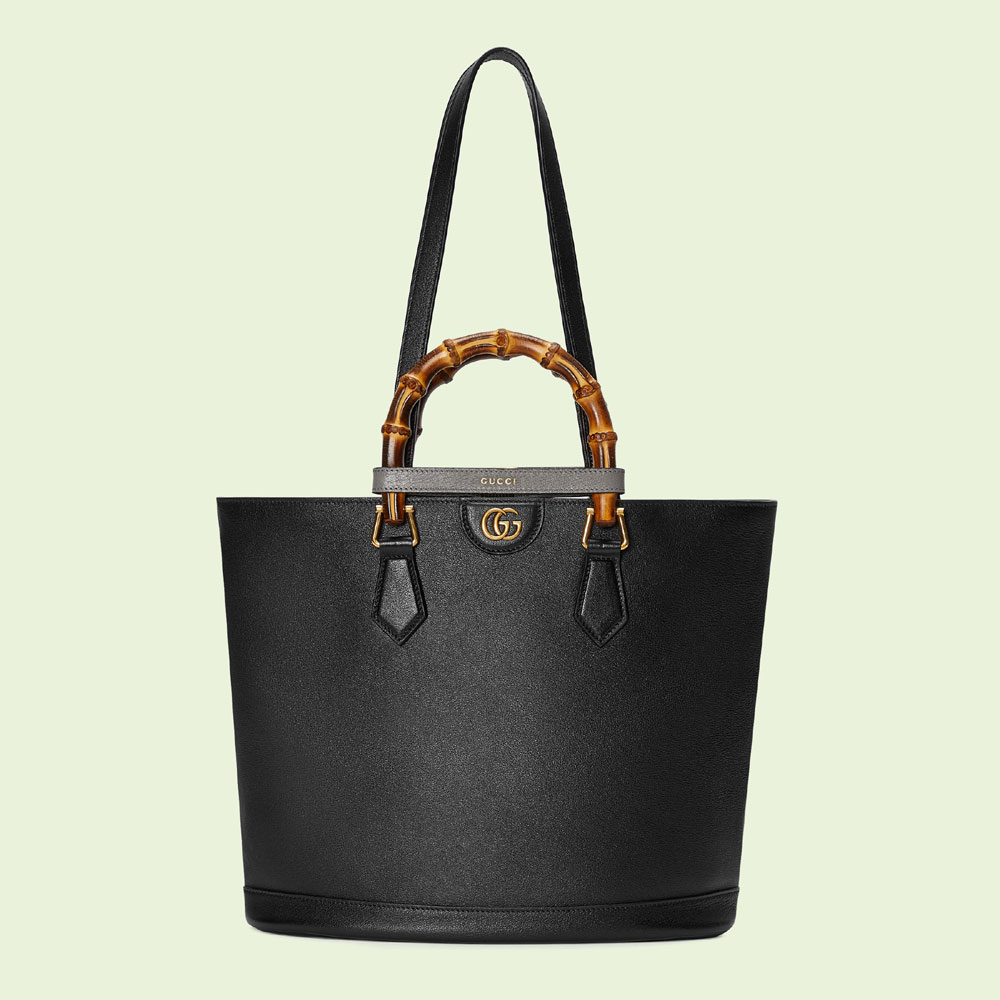 Speaking to the narrative of evolution and reinvention that runs through Guccis designs. the Gucci Diana reimagines a bamboo tote from the '90s archives. Crafted in soft black leather. this spacious silhouette reveals two leather handles that can be folded into the interior. allowing versatility in styling it as a shoulder bag or top handle.