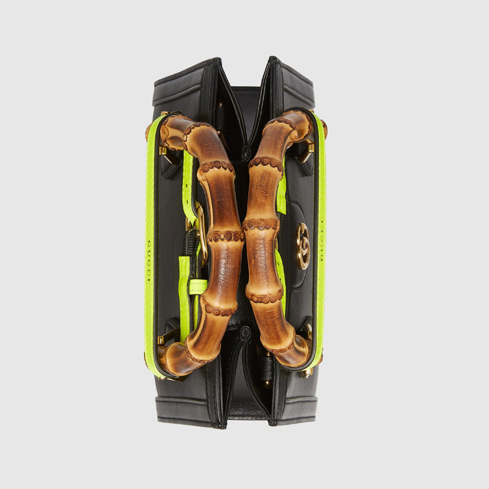 Combining recognizable elements of the House. the mini tote bag is defined by its bamboo handles and Double G hardware. Crafted from black leather. the accessory is further accentuated by two neon bands. a playful reference to the bands used to keep handles in shape.