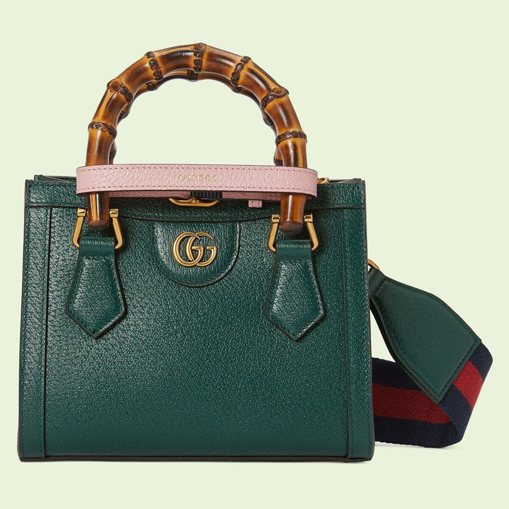 An evolution of a bamboo handle tote first introduced in 1991. the Gucci Diana represents the notion of style in constant evolution and is reimagined with removable. neon leather beltsa nod to the functional bands used to keep the handles in shape.?Here. a mini version of the emblematic style is presented in green leather.
