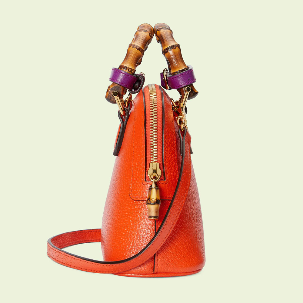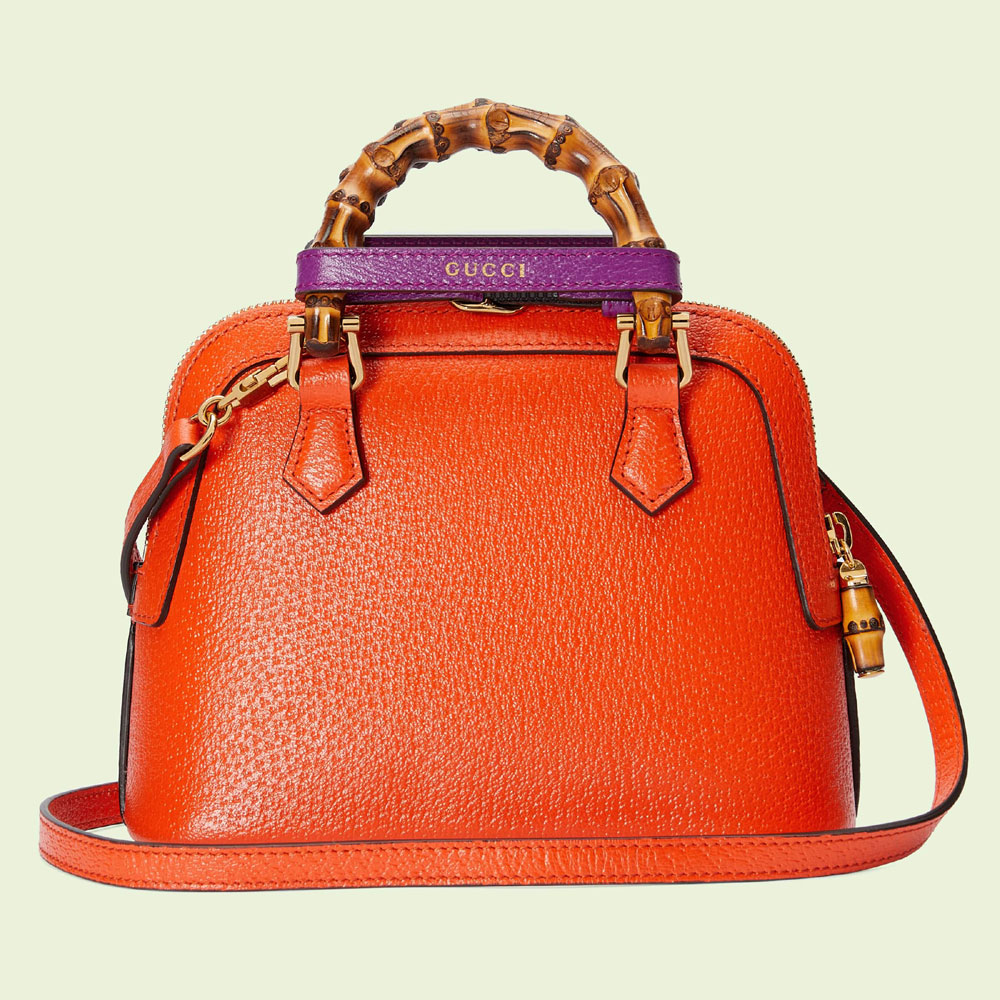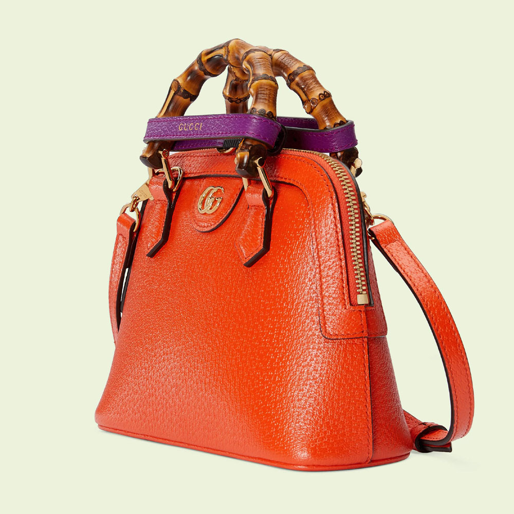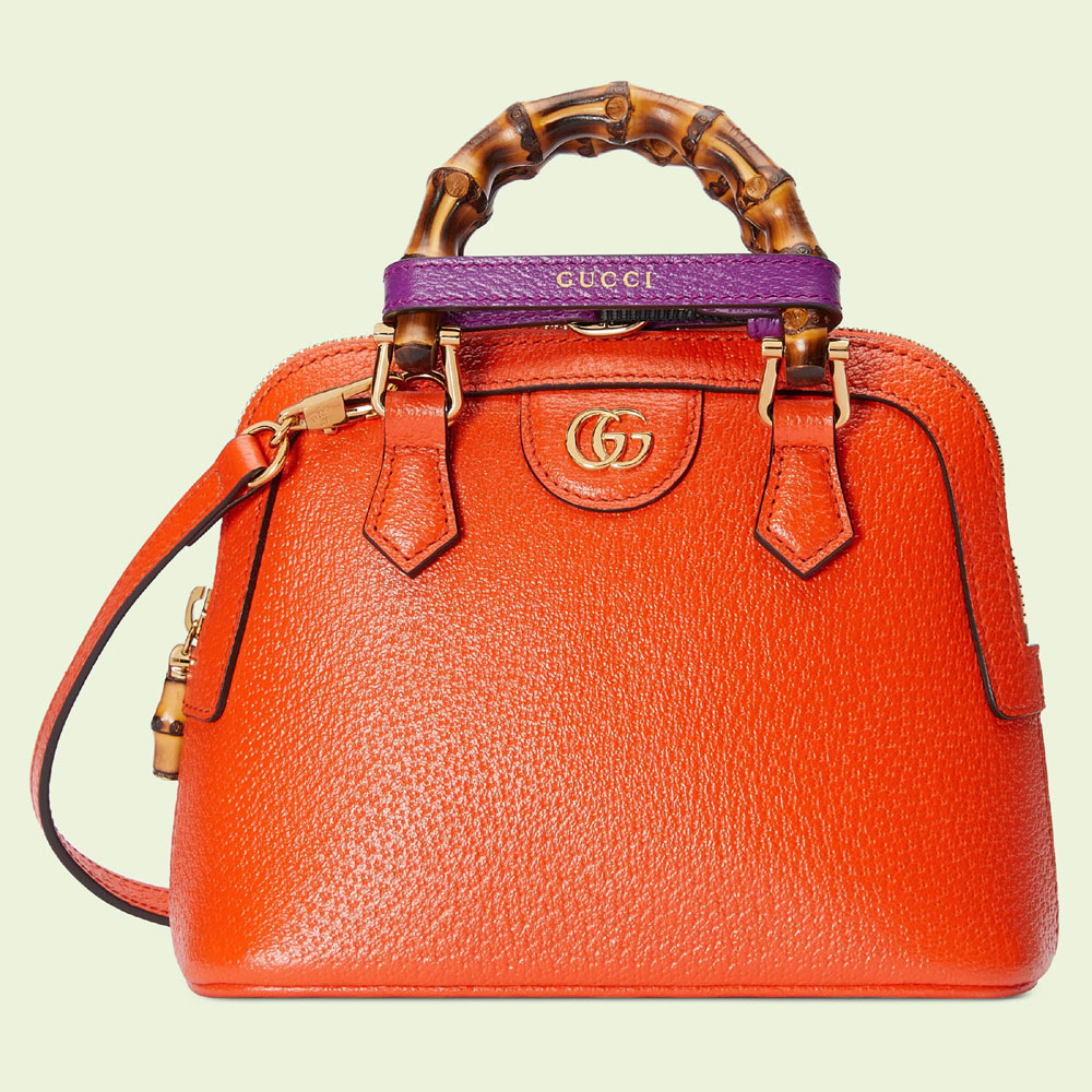 Combining recognizable elements of the House. the mini tote bag is defined by its bamboo handles and Double G hardware. Crafted from orange leather. the accessory is further accentuated by two bands. a playful reference to the bands used to keep handles in shape.