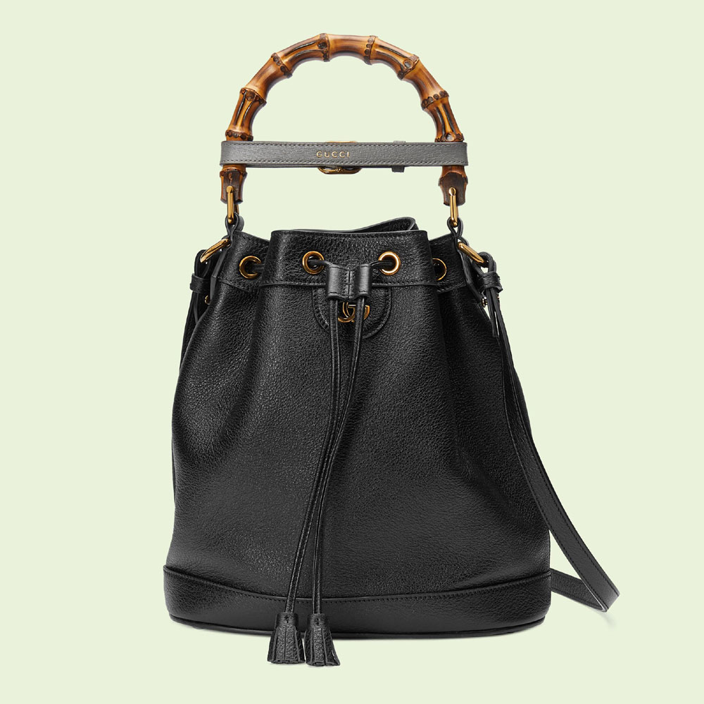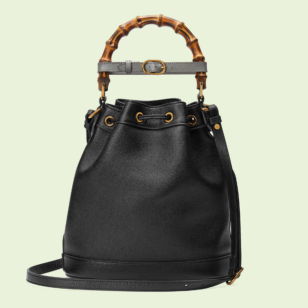 Combining recognizable elements of the House. the small bucket bag is defined by its bamboo handles and Double G hardware. Crafted from black leather. the accessory is further accentuated by a decorative leather belt. a playful reference to the bands used to keep handles in shape.