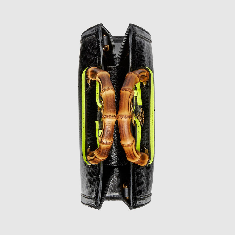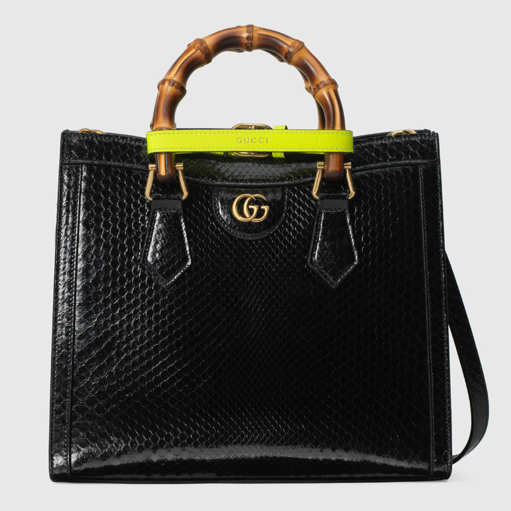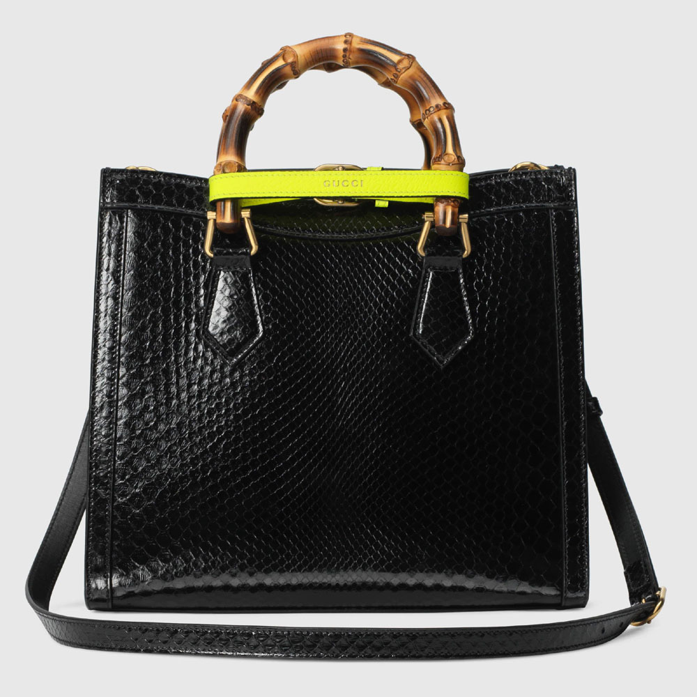 Combining recognizable elements of the House. the small tote bag is defined by its bamboo handles and Double G hardware. Crafted from black python. the accessory is further accentuated by two neon bands. a playful reference to the bands used to keep handles in shape.
